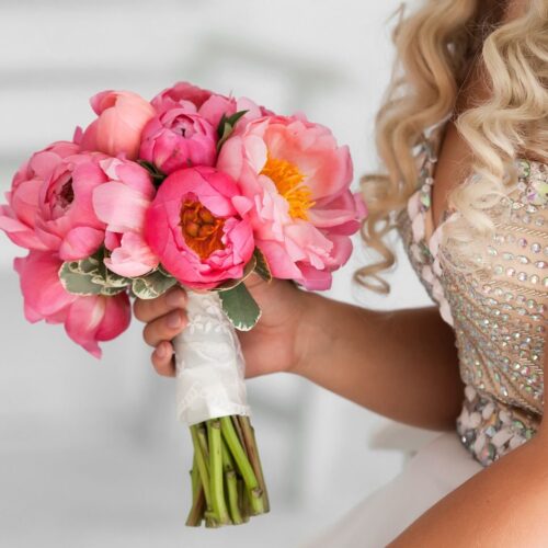 Aphrodite’s Kiss ( Opening Photo above Title ): A poetic blend of coral peonies, blush roses, lisianthus, and airy astilbe, this bouquet evokes the essence of the goddess of love. Wrapped in flowing greenery, its soft, radiant tones reflect the warmth of an Athenian Riviera sunset. Romantic, feminine, and touched with mythic charm, it’s made for brides who wish to walk in beauty, kissed by Aphrodite herself. Flowery Santorini