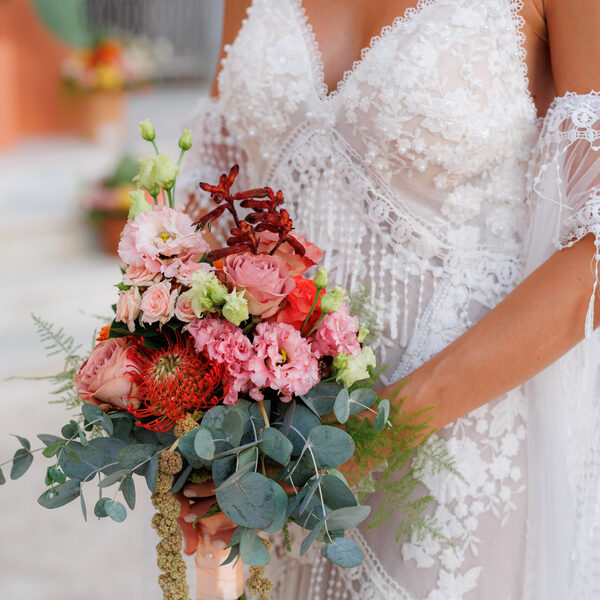 Calliope’s Coral Bloom: A vibrant bouquet of pink and coral blooms, where lisianthus and roses are paired with protea and anigozanthos for a bold yet balanced result. Eucalyptus and cascading amaranthus add texture and movement, bringing a natural, free-flowing elegance to the composition. A beautiful choice for weddings with boho nuances and an organic, natural style. Noufaro
