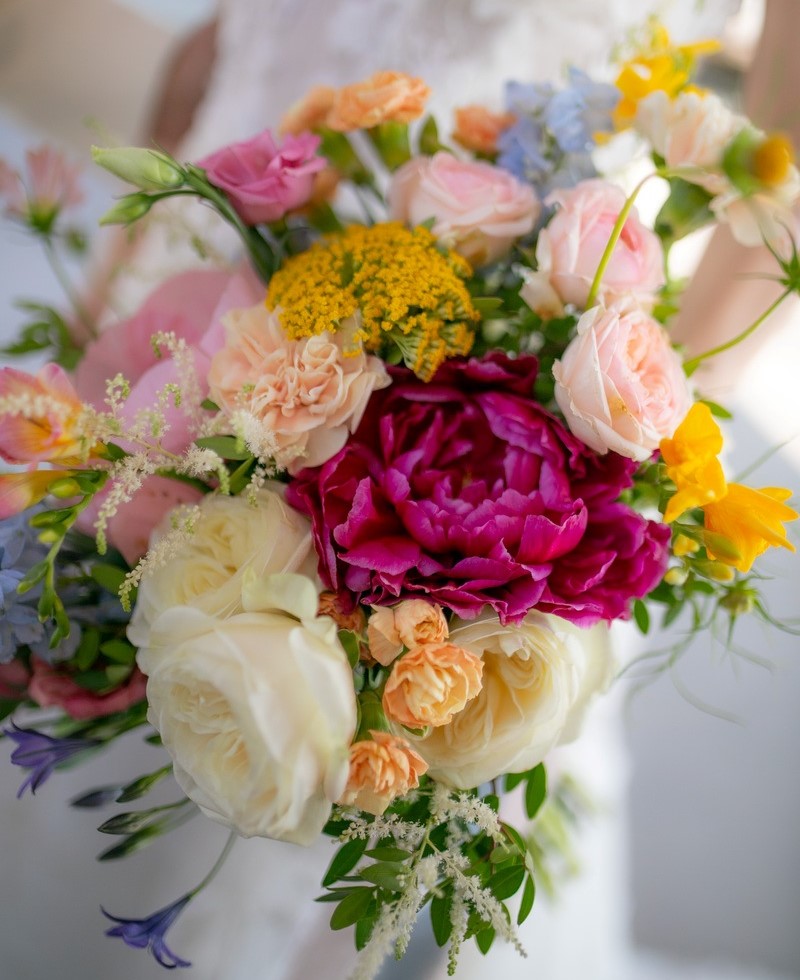 Sappho’s Blooming Verse: A bouquet that feels as though it has emerged from the verses of Sappho, expressive, vibrant, and full of emotion. A striking fuchsia peony takes the spotlight, surrounded by soft blush and ivory roses, while delicate wildflowers and airy greenery introduce movement and a sense of spontaneity. The richness of color is balanced by the softness of texture, echoing the dual nature of love once captured in the poetry of Lesvos’ most celebrated voice, intense yet delicate. This bouquet is made for brides drawn to something vivid and deeply romantic. Menta Floral Creations