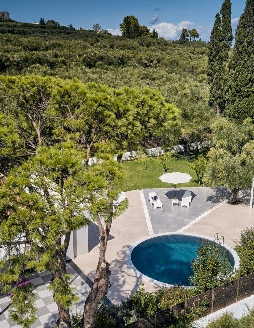 Outside, a generous space invites relaxation, with a barbecue area and a distinctive round pool—perfect for enjoying sunny moments and peaceful evenings. This is an idyllic setting for intimate wedding ceremonies and elegant receptions, making your big day in Zakynthos unforgettable.
