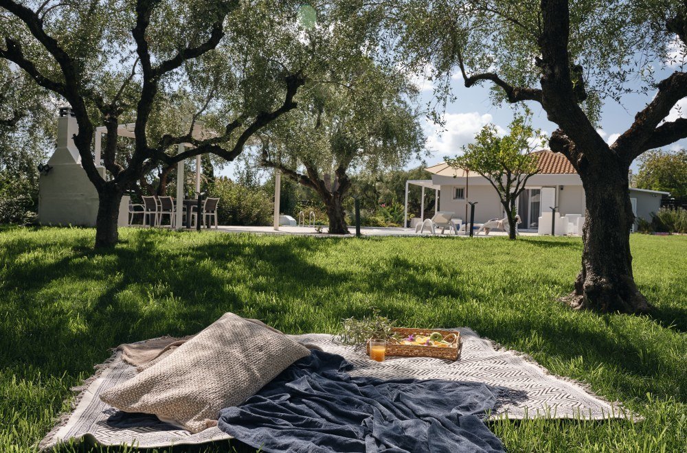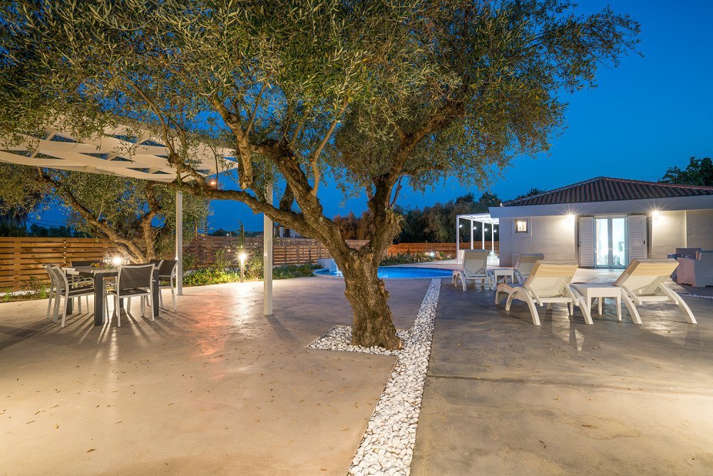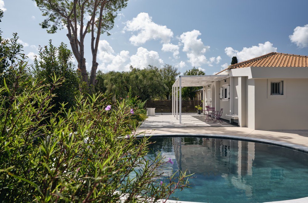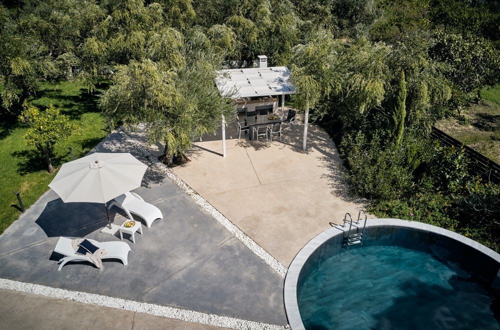 Outside, a generous space invites relaxation, with a barbecue area and a distinctive round pool—perfect for enjoying sunny moments and peaceful evenings. This is an idyllic setting for intimate wedding ceremonies and elegant receptions, making your big day in Zakynthos unforgettable.