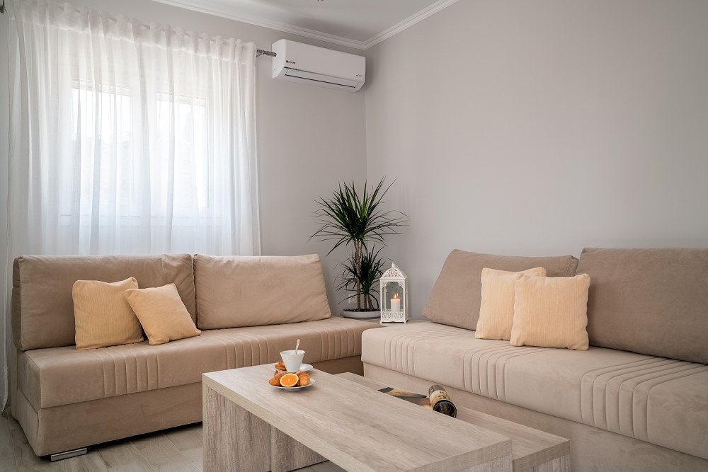The villa includes three comfortable bedrooms and can host up to eight guests. Upon entering, you are welcomed into a spacious living room with an open-plan, fully equipped kitchen on the right. The living area also features two double sofa beds, ideal for additional guests.
