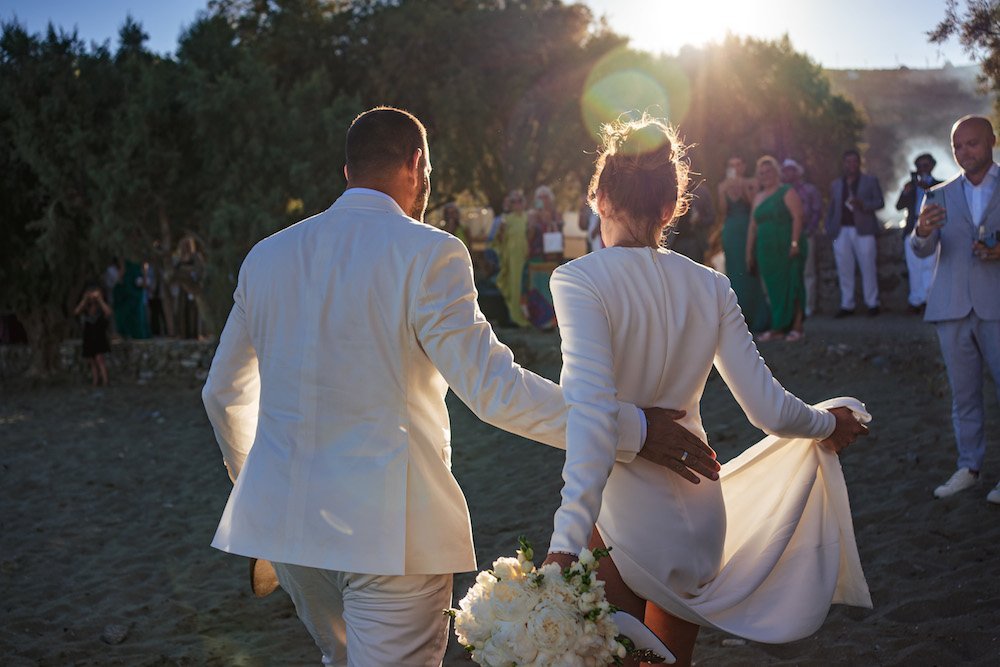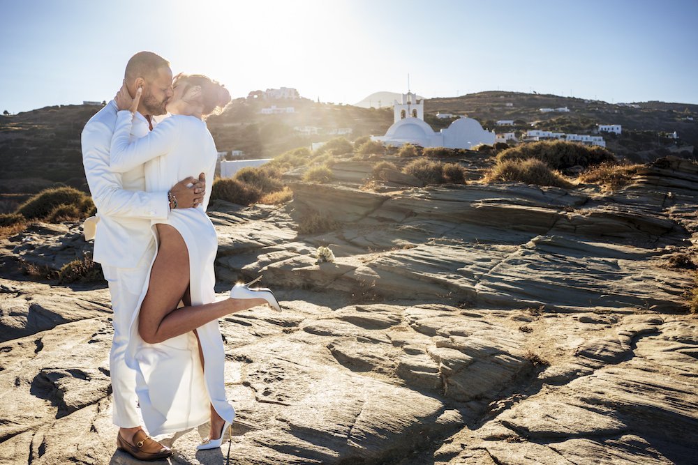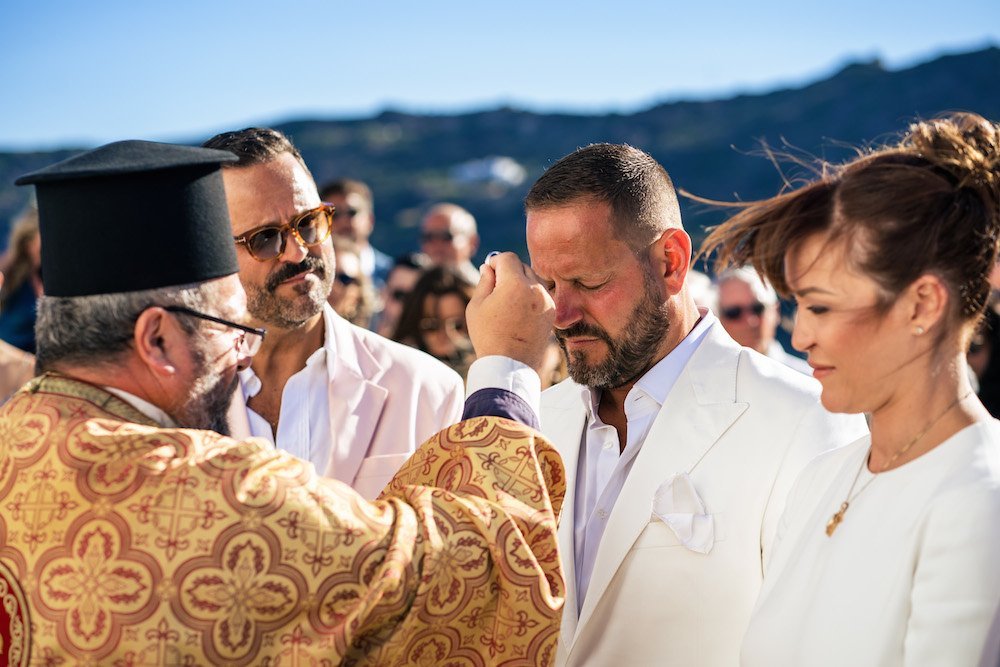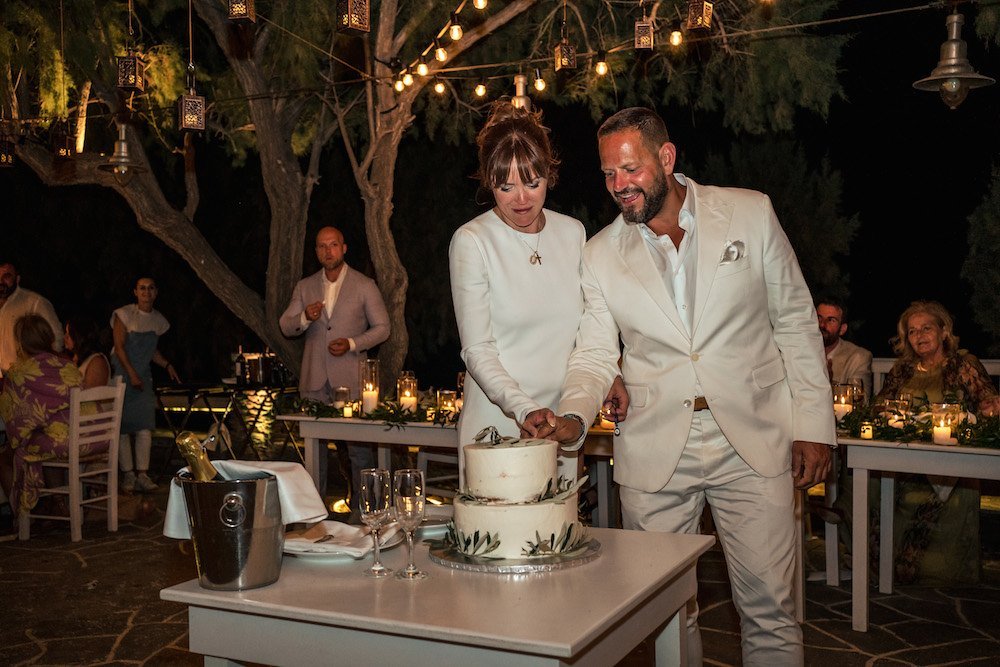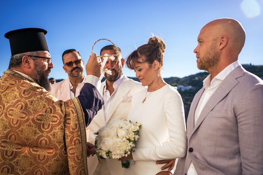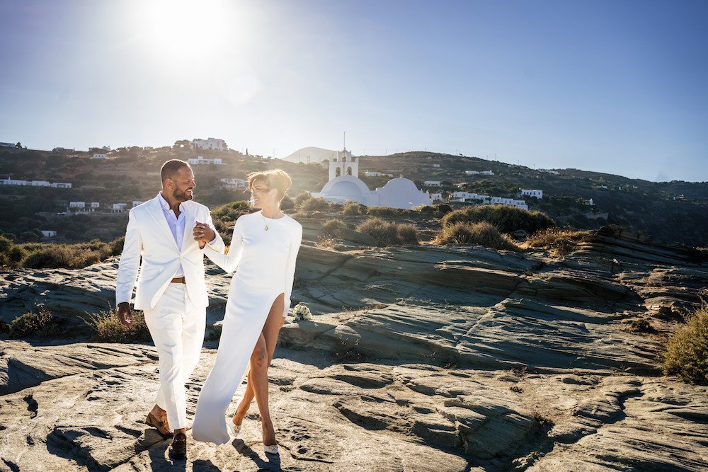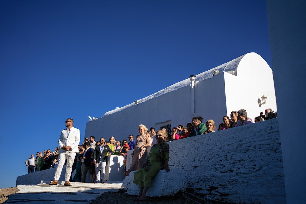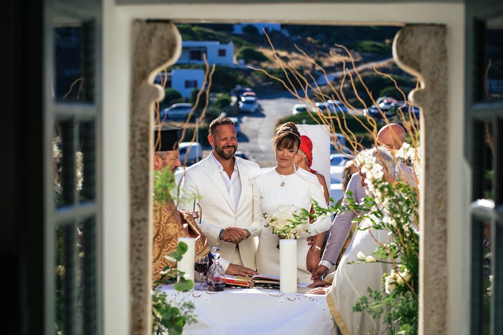 Their wedding in Sifnos was the embodiment of glamour and surprise, with hues of deep Aegean blue and timeless white. Ania, stunning in a head-turning Tom Ford wedding gown, exchanged vows with Thanos at the iconic Chrysopigi Monastery, which stood majestically on a rocky hill with sweeping sea views.