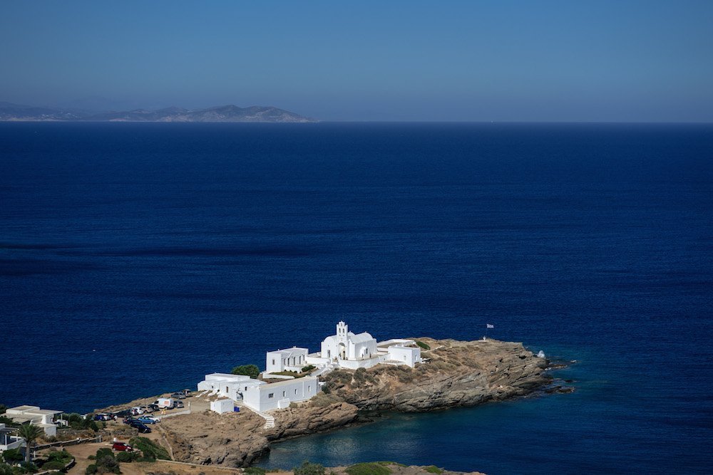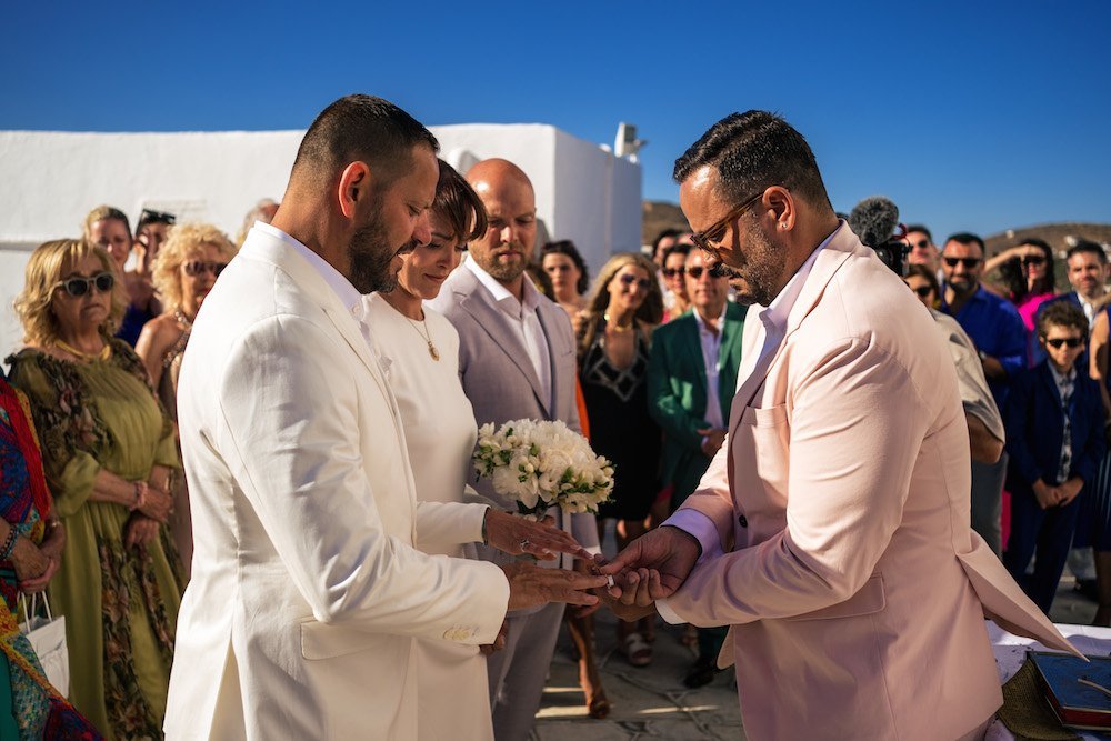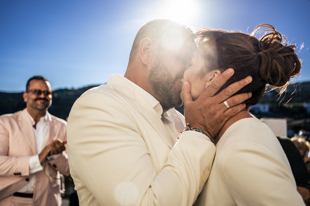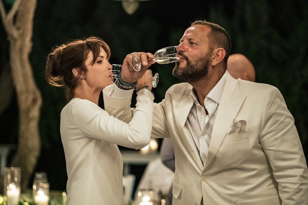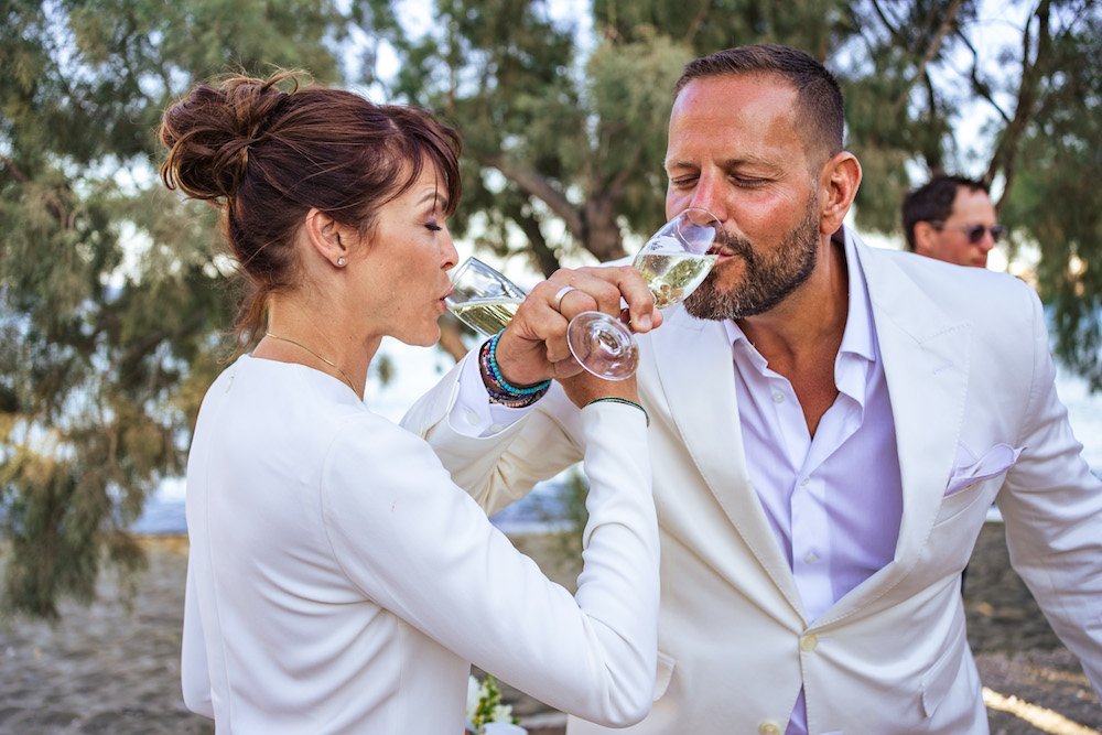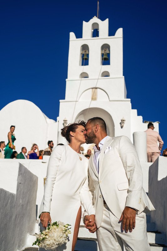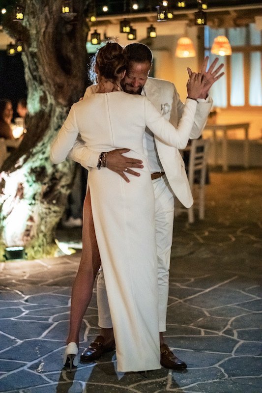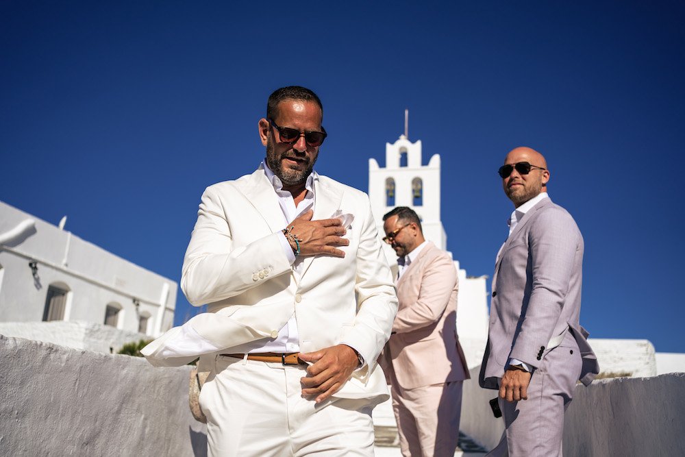 Their wedding in Sifnos was the embodiment of glamour and surprise, with hues of deep Aegean blue and timeless white. Ania, stunning in a head-turning Tom Ford wedding gown, exchanged vows with Thanos at the iconic Chrysopigi Monastery, which stood majestically on a rocky hill with sweeping sea views.