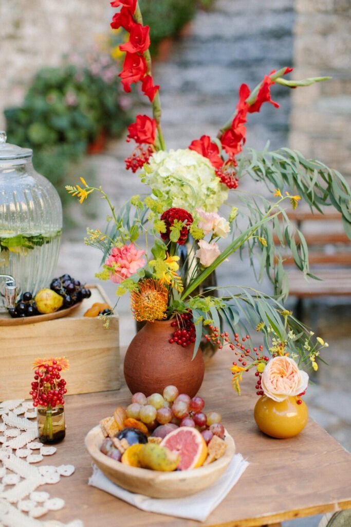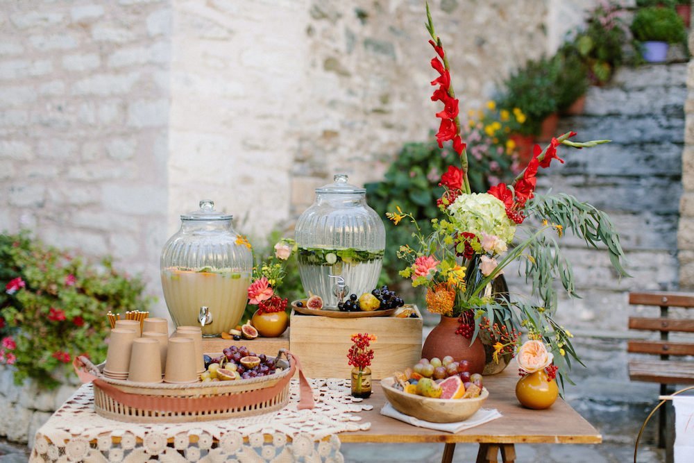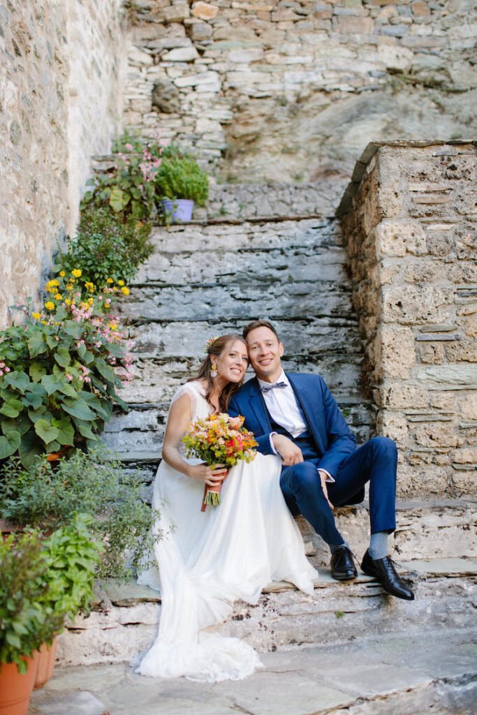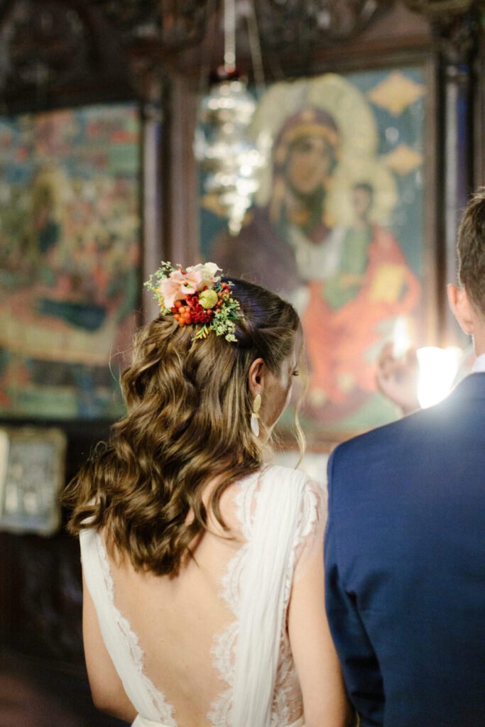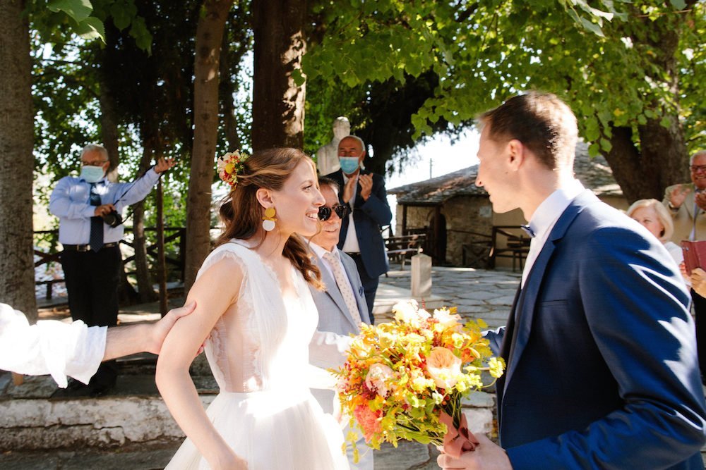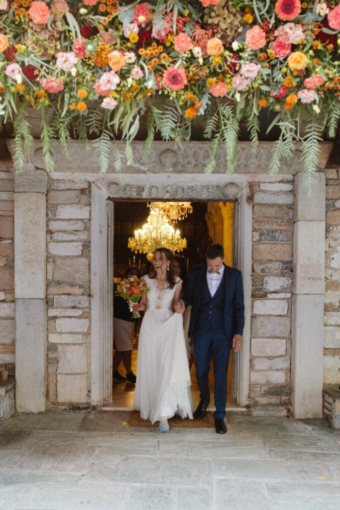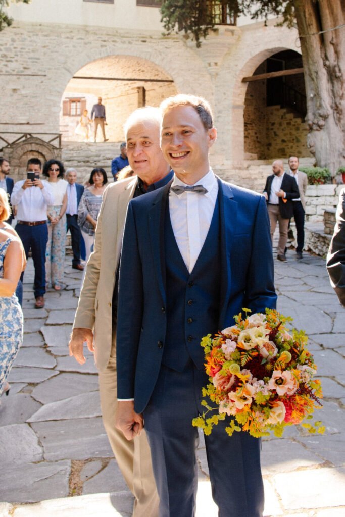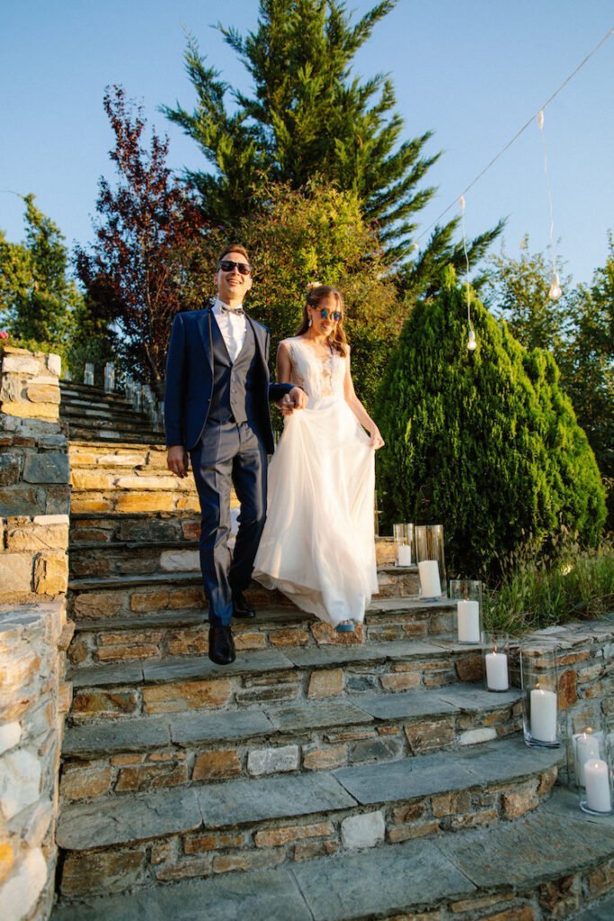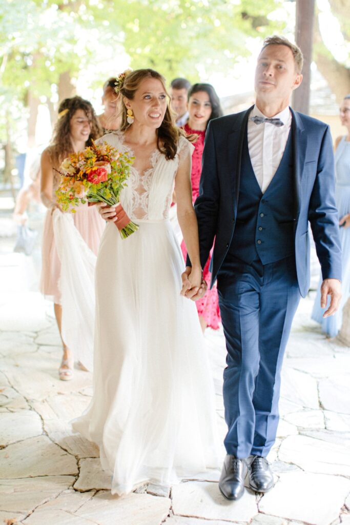 The villages of Portaria, nestled on the mountain slope, are built with traditional Pelion architecture, with stunning views of the thick hillsides and the azure sea. Who wouldn’t want to exchange vows in this natural setting with the sound of crystal-clear waters in the background? The wedding invitations, designed by the couple – from the central design to the color palette – drew inspiration from local architecture. They aimed for a blend of Pelion tradition with contemporaty touches, highlighted by warm terracotta hues reminiscent of Portaria’s courtyards. The ceremony took place at the Church of the Dormition of the Virgin Mary in Makrinitsa. Built in 1767, this church is an outstanding example of stone architecture in Greece. With the guidance of wedding planner Georgia Apostolidou of Pompon Story Events, the floral decorations aligned with the church’s traditional aesthetic. Floral arrangements added a romantic note and vibrant color, while refreshments and fresh fruit awaited the guests.