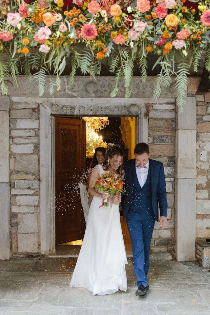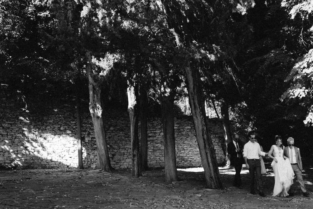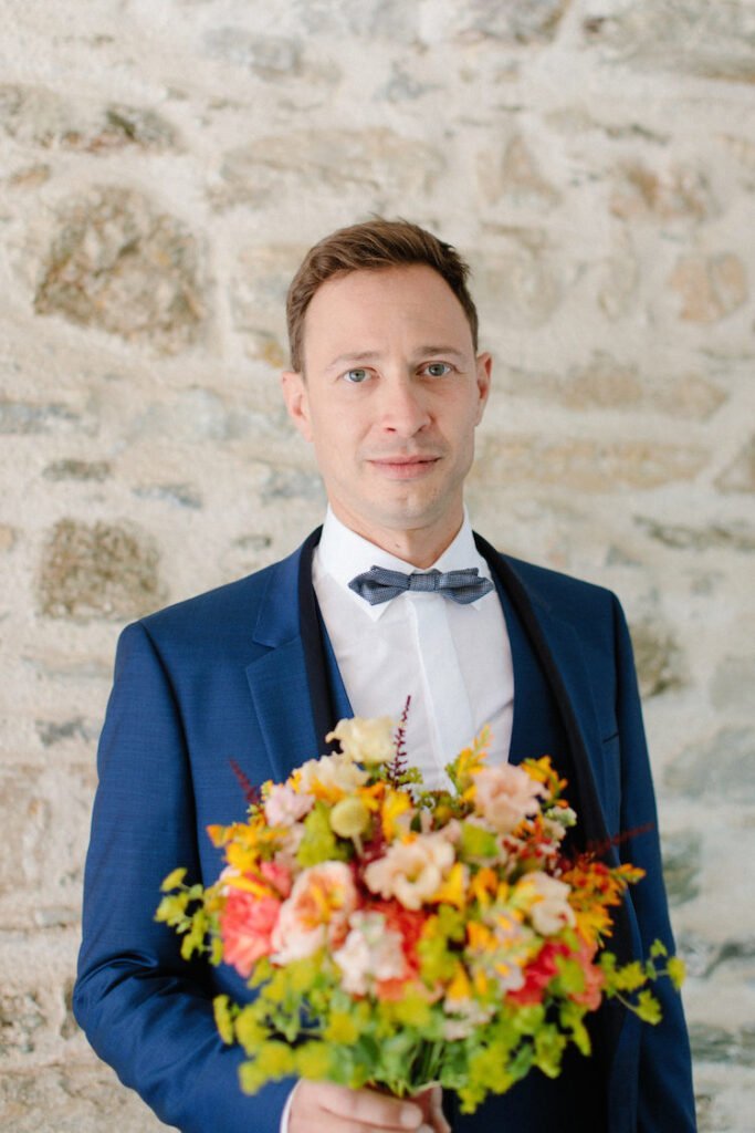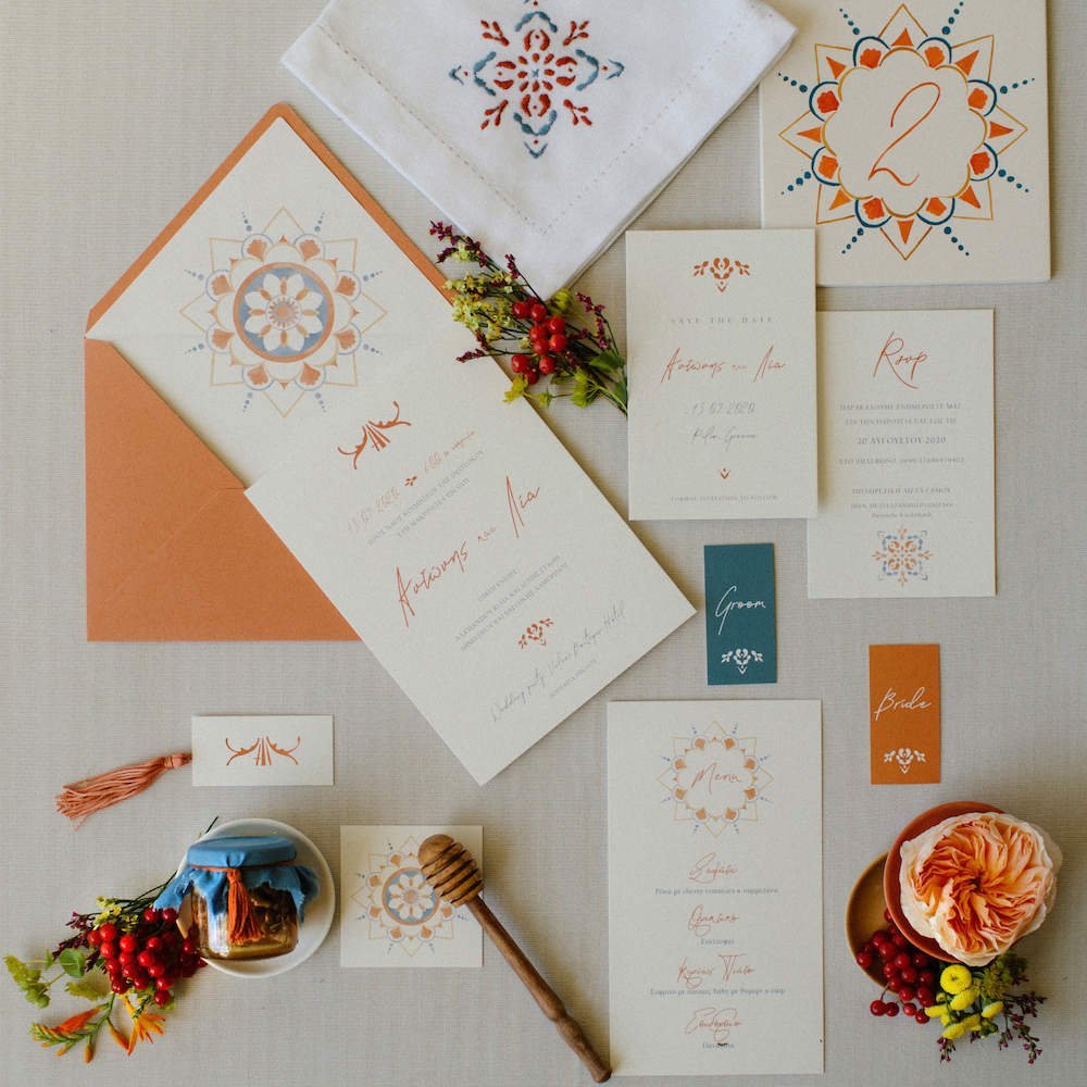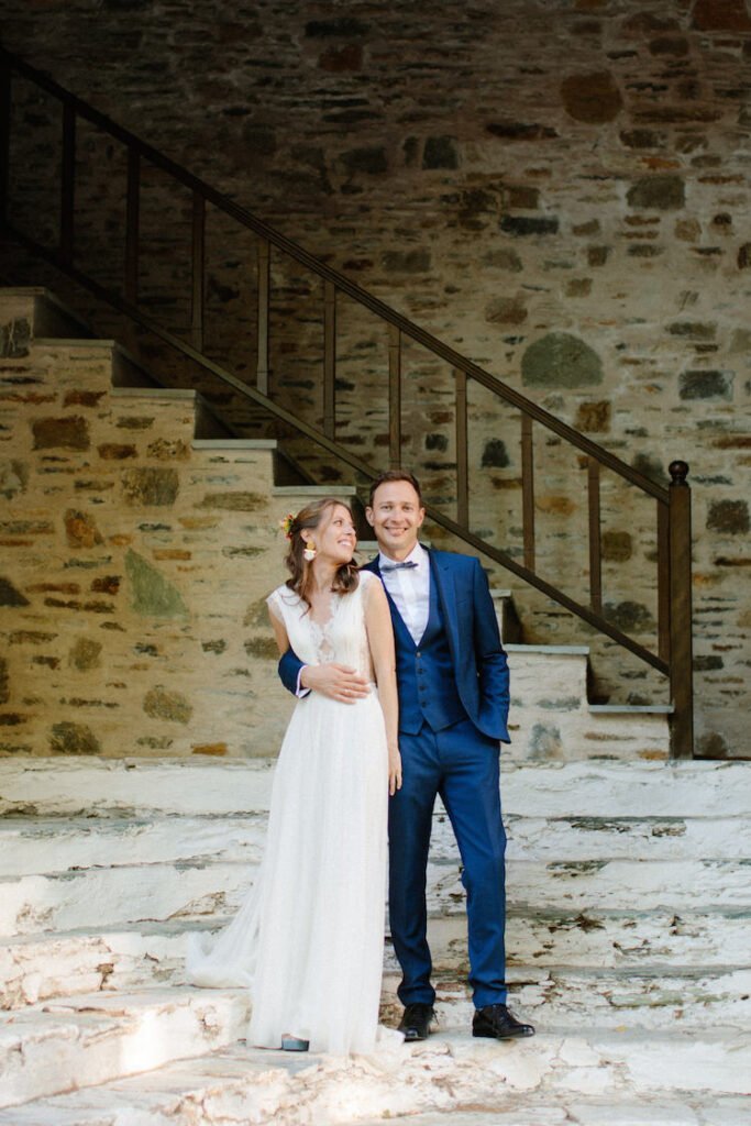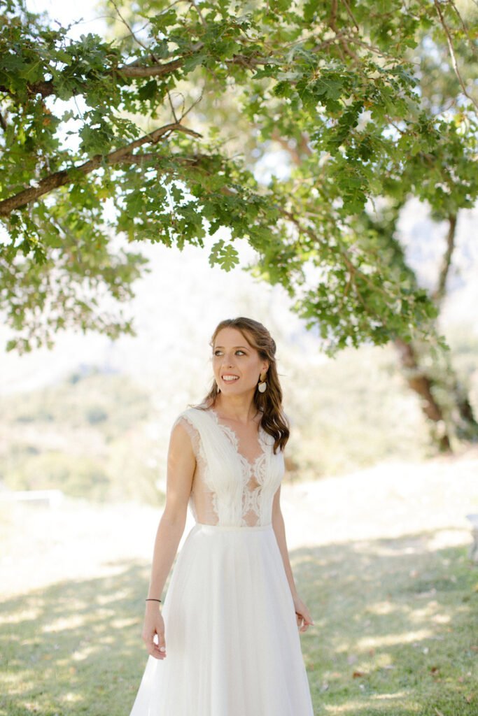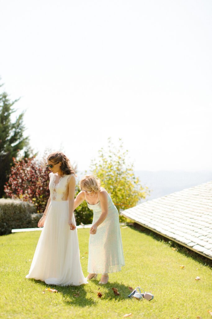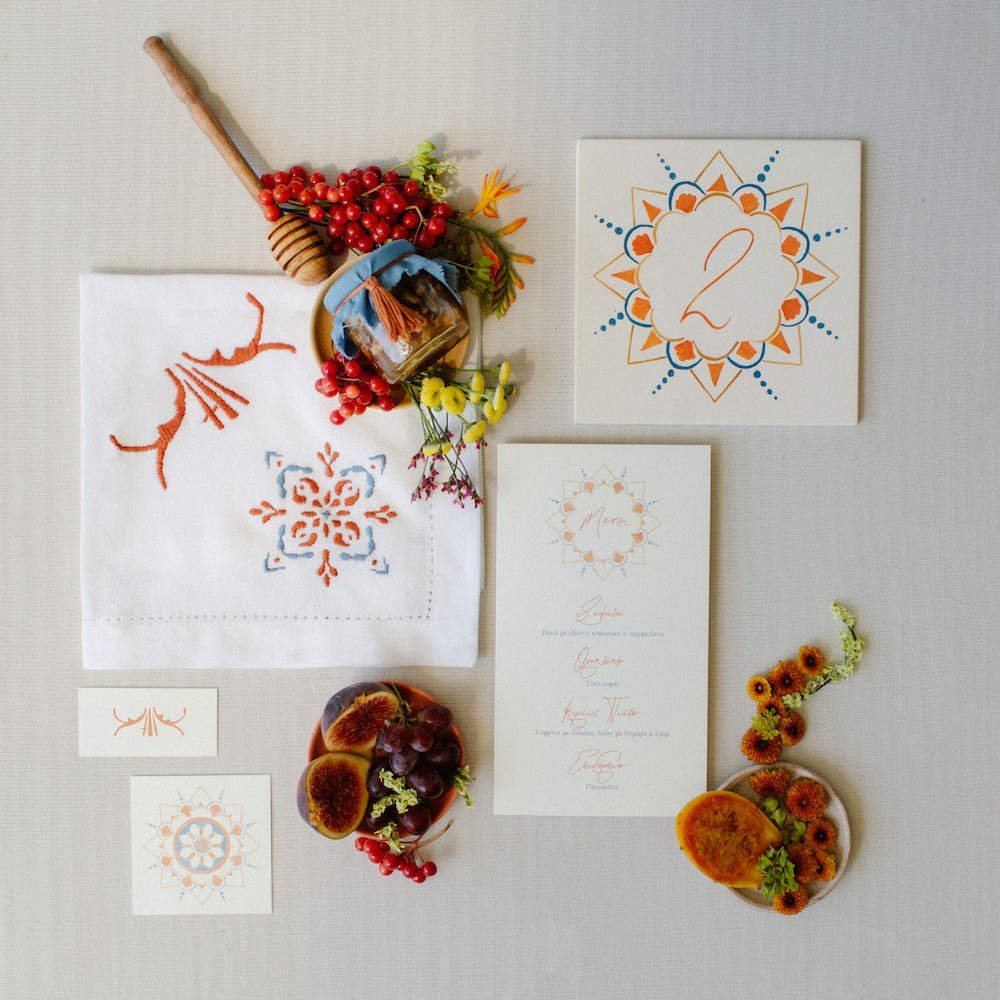 The villages of Portaria, nestled on the mountain slope, are built with traditional Pelion architecture, with stunning views of the thick hillsides and the azure sea. Who wouldn’t want to exchange vows in this natural setting with the sound of crystal-clear waters in the background? The wedding invitations, designed by the couple – from the central design to the color palette – drew inspiration from local architecture. They aimed for a blend of Pelion tradition with contemporaty touches, highlighted by warm terracotta hues reminiscent of Portaria’s courtyards. The ceremony took place at the Church of the Dormition of the Virgin Mary in Makrinitsa. Built in 1767, this church is an outstanding example of stone architecture in Greece. With the guidance of wedding planner Georgia Apostolidou of Pompon Story Events, the floral decorations aligned with the church’s traditional aesthetic. Floral arrangements added a romantic note and vibrant color, while refreshments and fresh fruit awaited the guests.