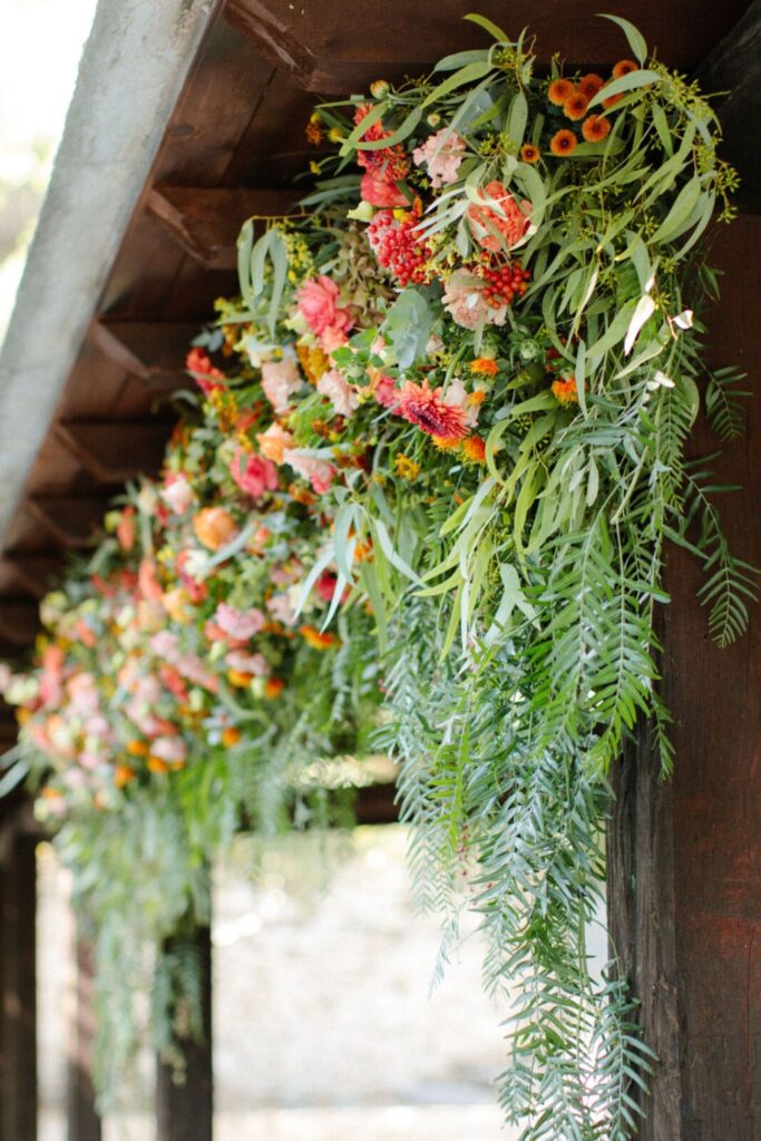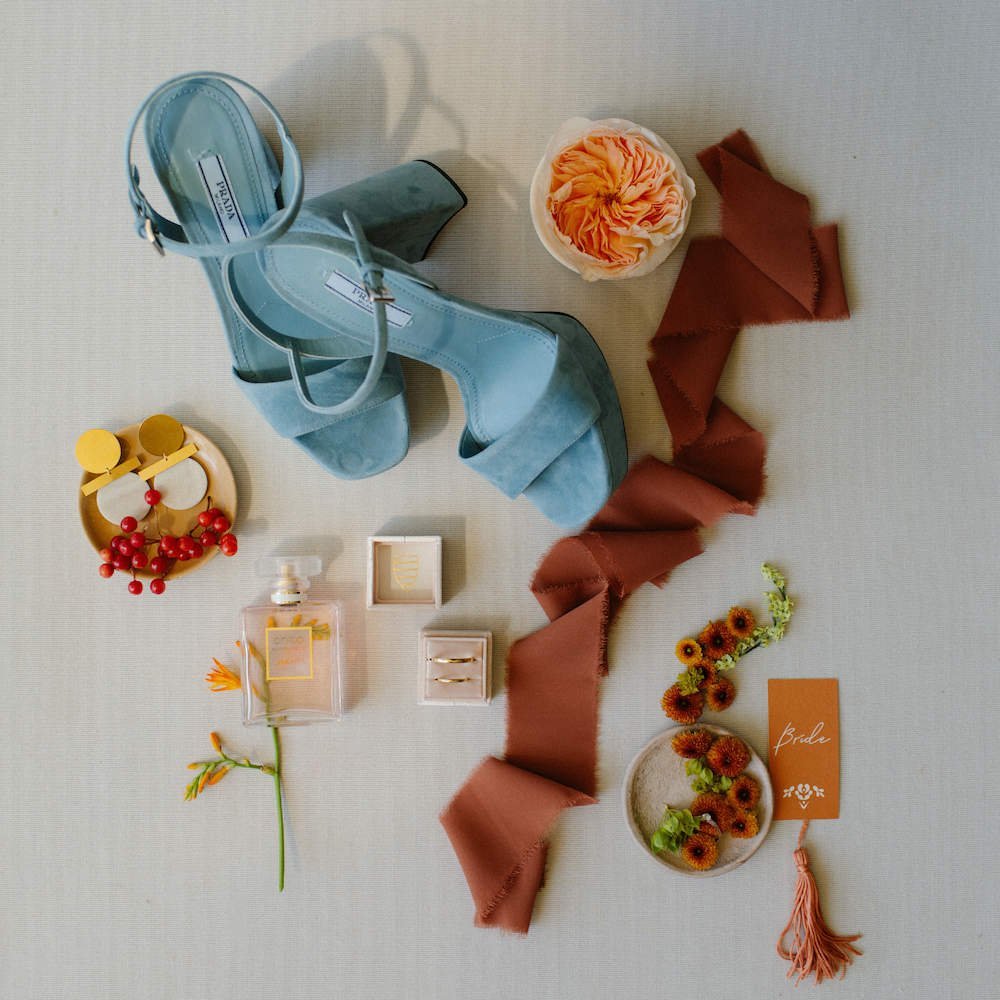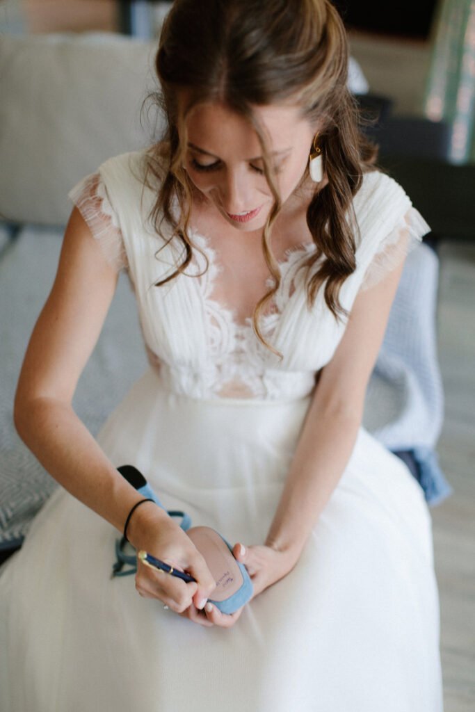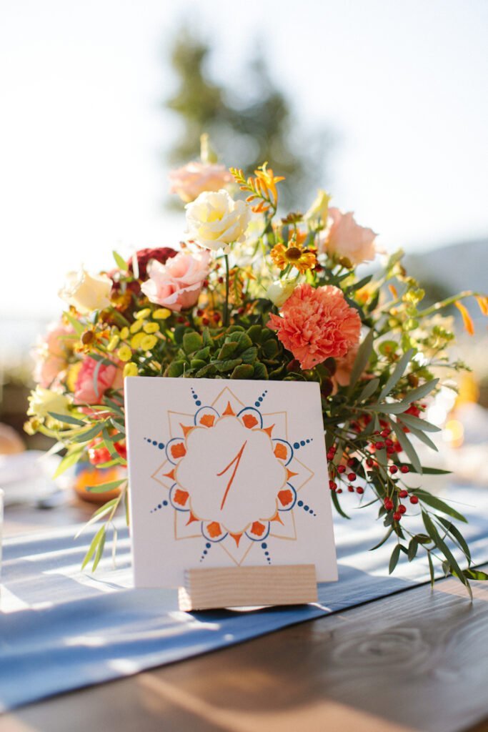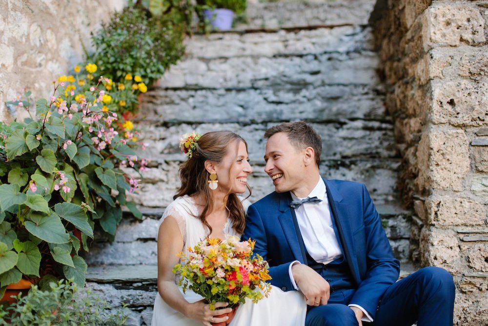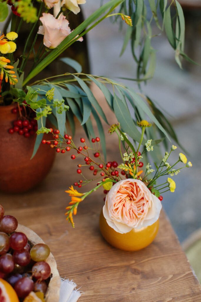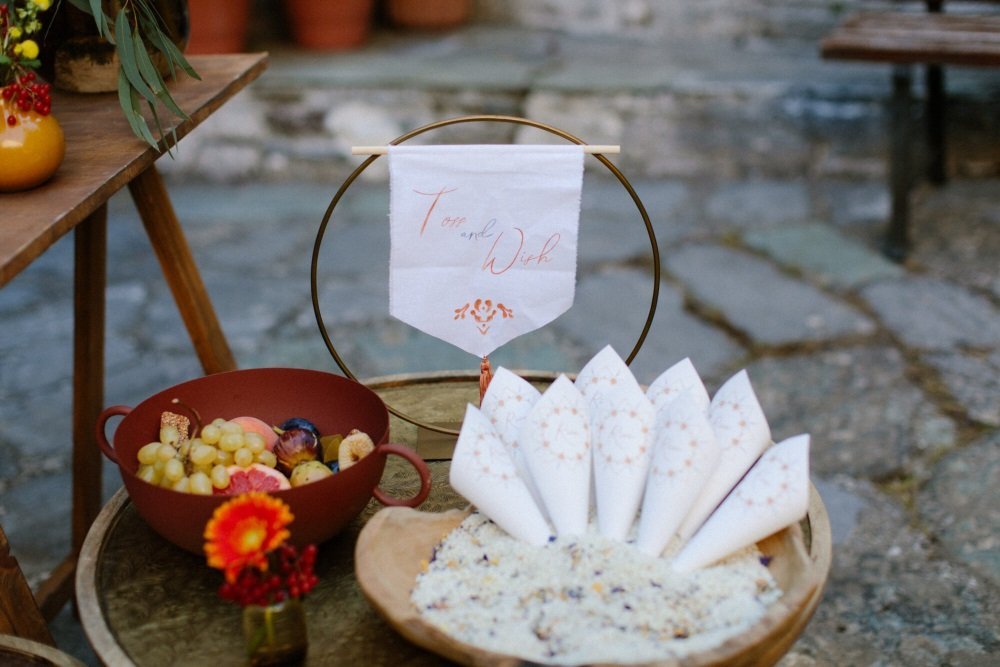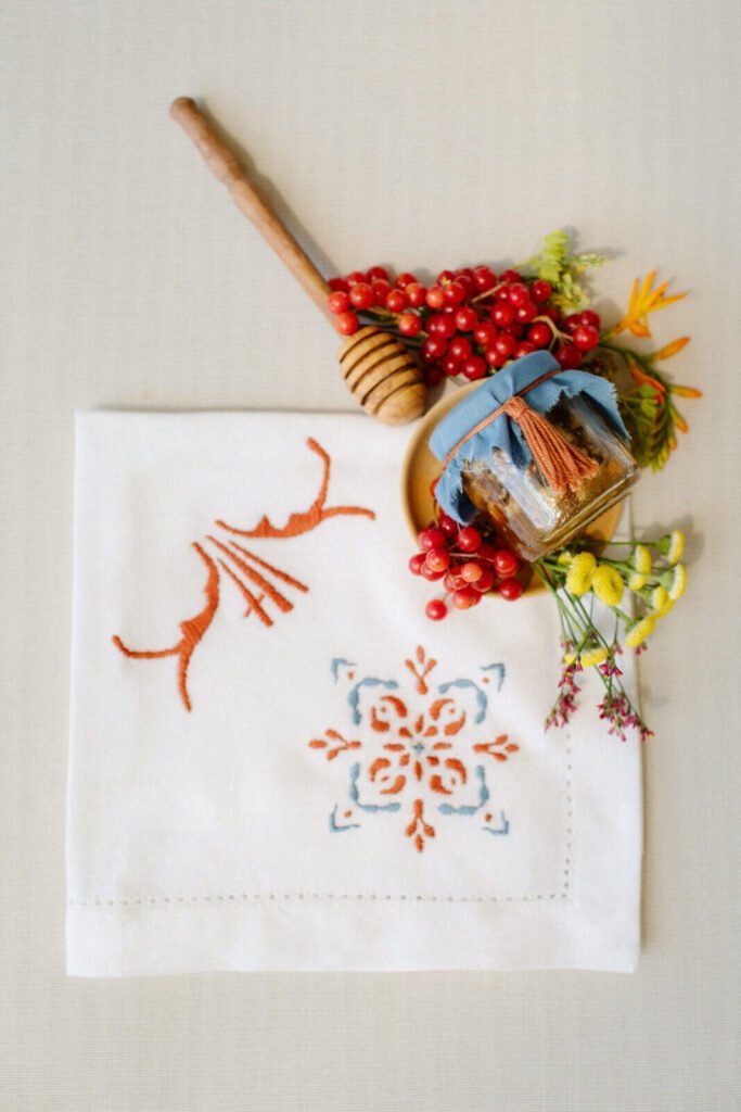 The villages of Portaria, nestled on the mountain slope, are built with traditional Pelion architecture, with stunning views of the thick hillsides and the azure sea. Who wouldn’t want to exchange vows in this natural setting with the sound of crystal-clear waters in the background? The wedding invitations, designed by the couple – from the central design to the color palette – drew inspiration from local architecture. They aimed for a blend of Pelion tradition with contemporaty touches, highlighted by warm terracotta hues reminiscent of Portaria’s courtyards. The ceremony took place at the Church of the Dormition of the Virgin Mary in Makrinitsa. Built in 1767, this church is an outstanding example of stone architecture in Greece. With the guidance of wedding planner Georgia Apostolidou of Pompon Story Events, the floral decorations aligned with the church’s traditional aesthetic. Floral arrangements added a romantic note and vibrant color, while refreshments and fresh fruit awaited the guests.