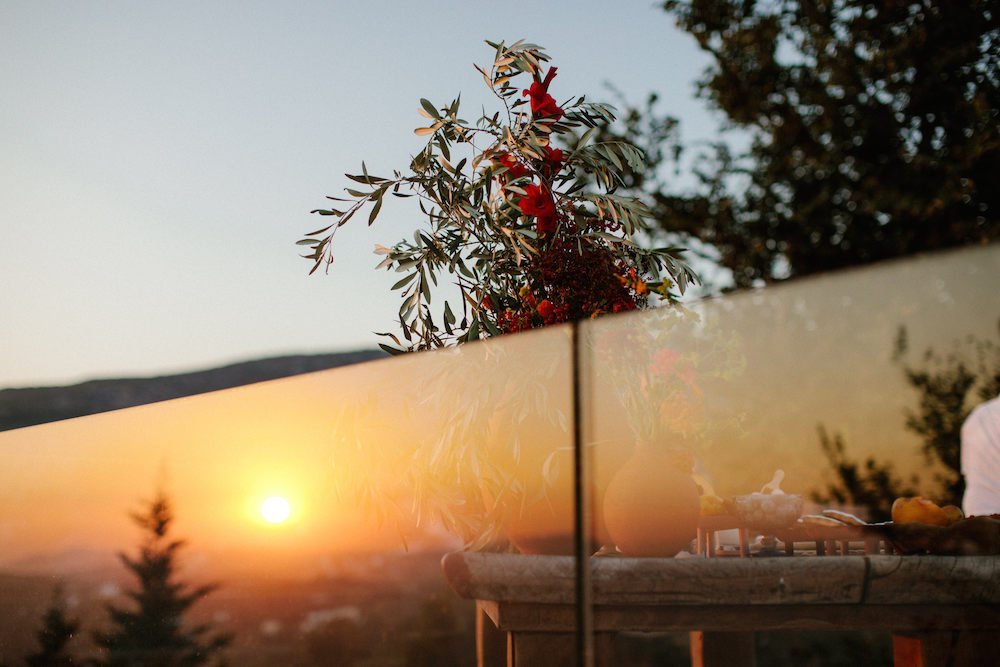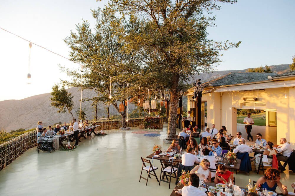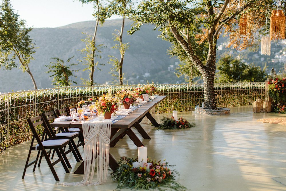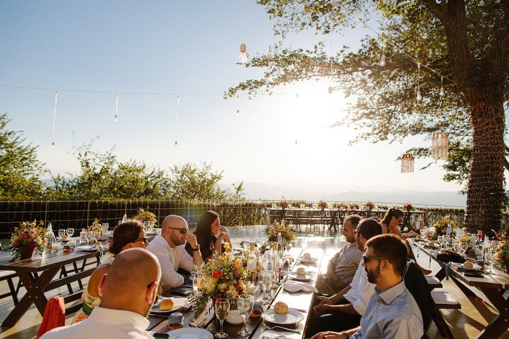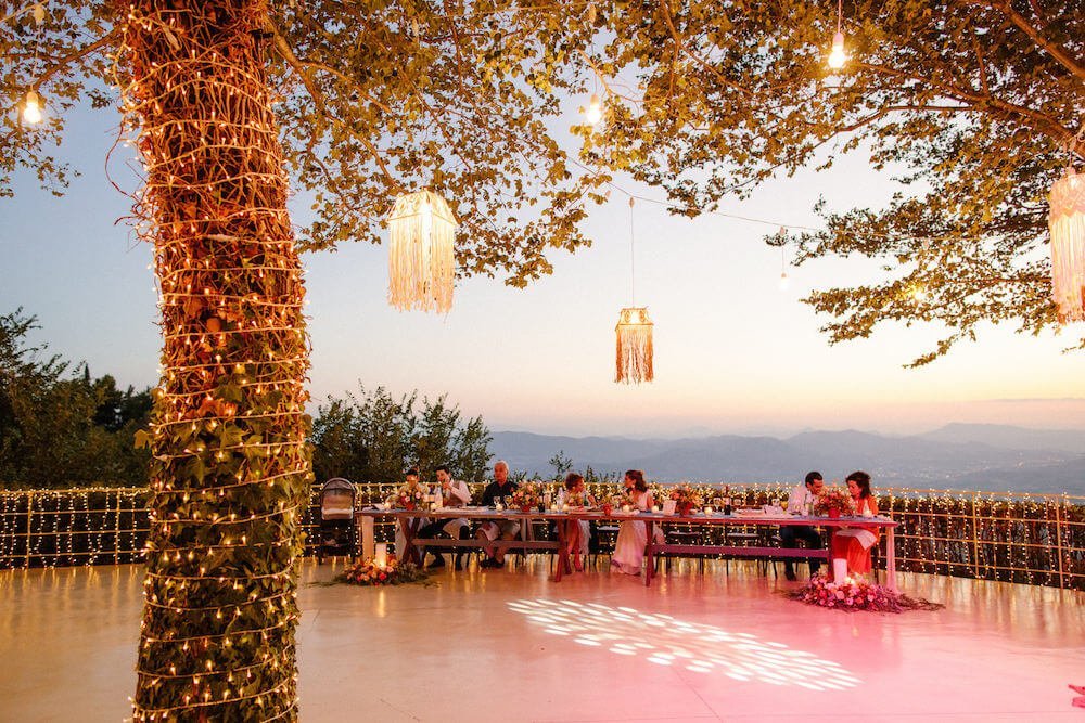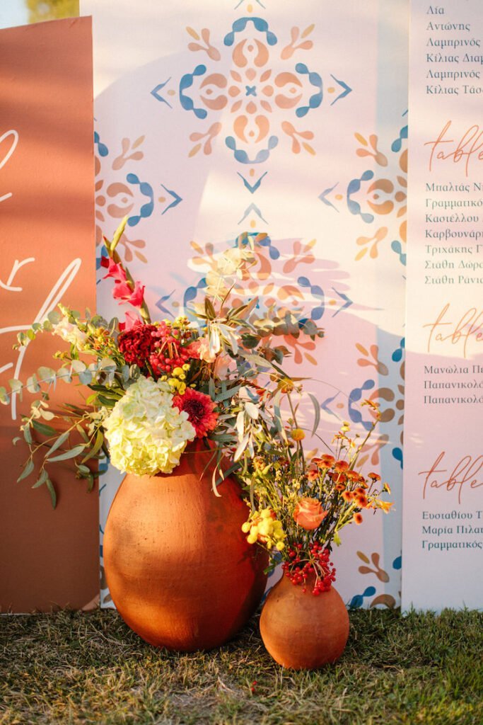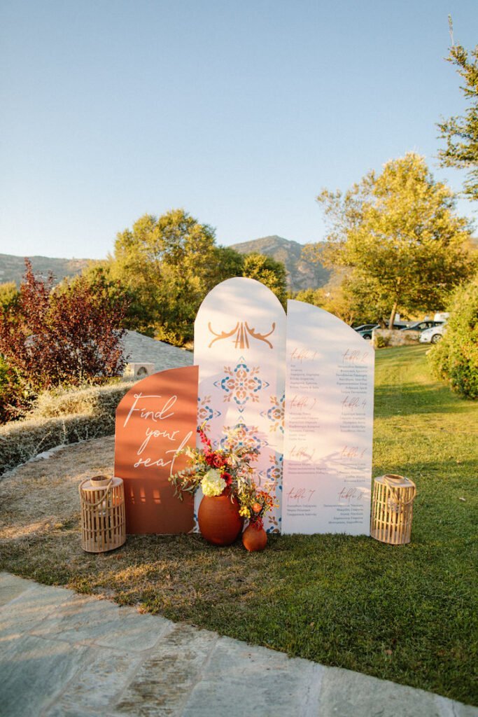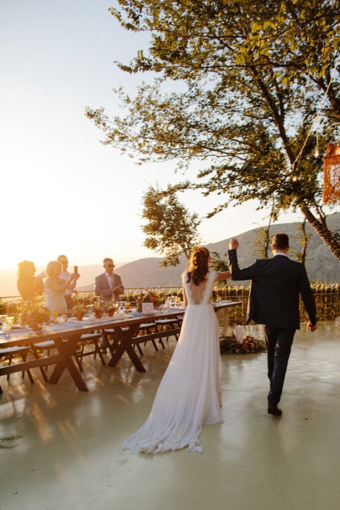 The reception just flowed in the outdoor space of Valeni Boutique Hotel & Spa, where a golden sunset and panoramic views over Volos created a romantic and magnificent backdrop for an evening of elegance and celebration. At this remarkable venue, tradition and modernity mix, weaving together scenes of stunning beauty. A beautifully designed seating board guided guests to their seats, as welcome drinks and elegant canapés were served in anticipation of the newlyweds. Ceramic vases overflowing with vibrant blooms dressed the wooden tables, covered with linen and dusty-blue runners. Macramé accents and embroidered napkins added an artisanal touch to the setting. The atmospheric lighting of Valeni, authentic Greek flavors, and a flower-adorned bar serving fresh cocktails infused the evening with festive jubilance. On the specially designed dance floor, Apostolia and Antonis celebrated beneath the lights, dancing the night away. One by one, guests and family joined in, and the evening evolved into a spirited celebration of love and togetherness.