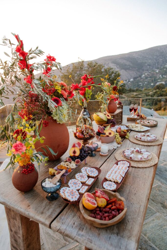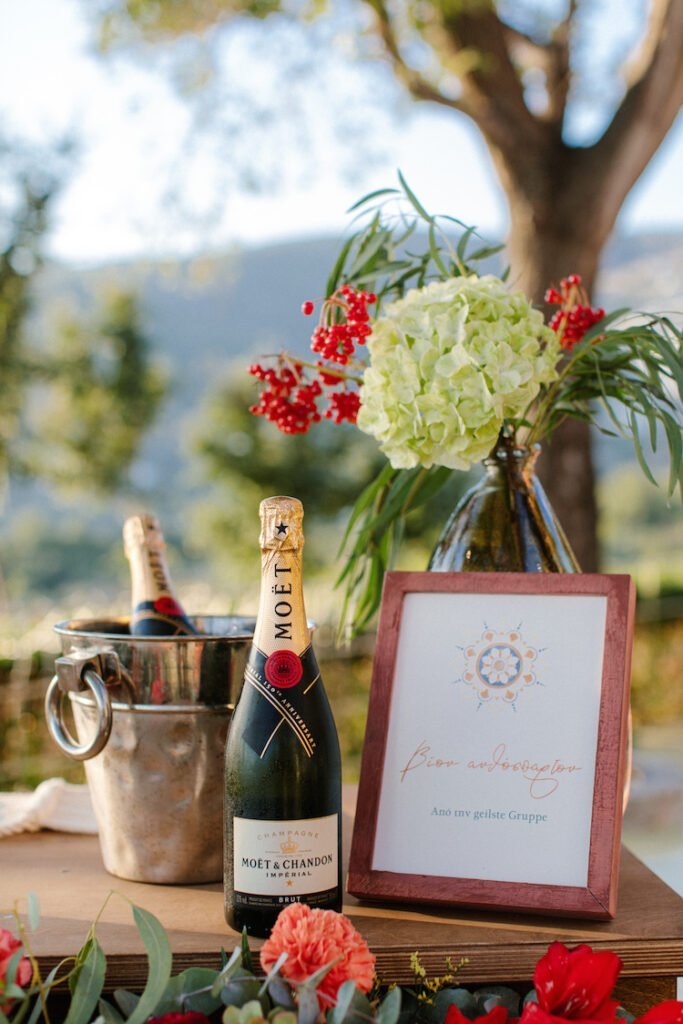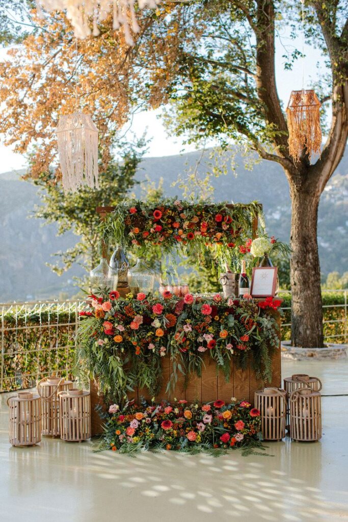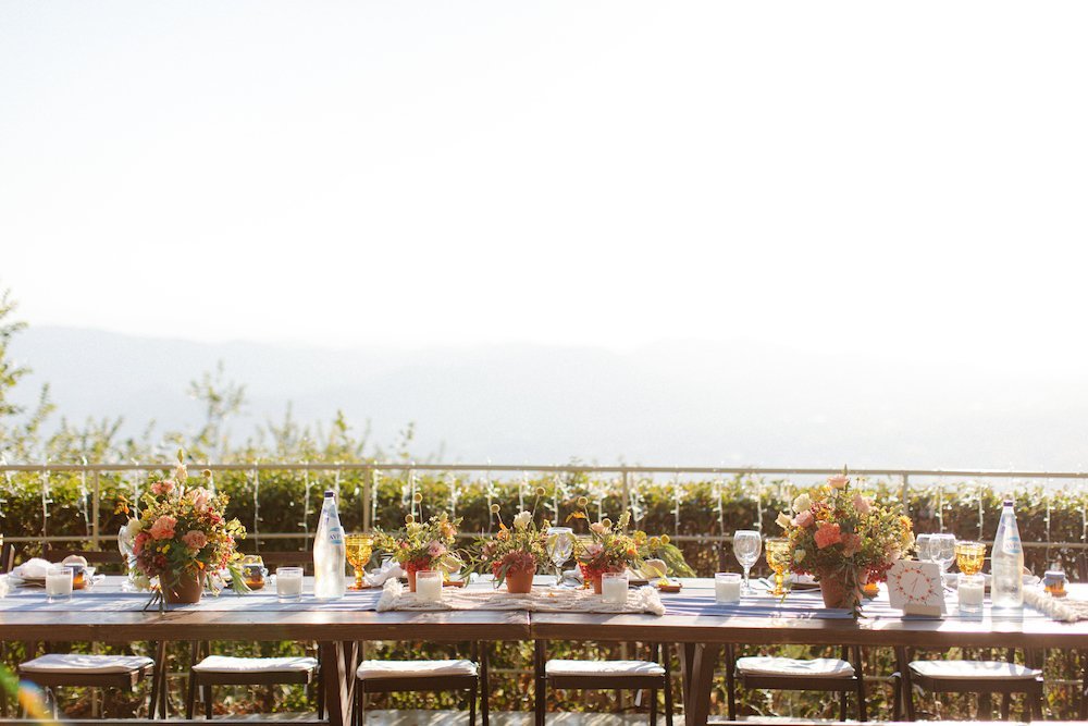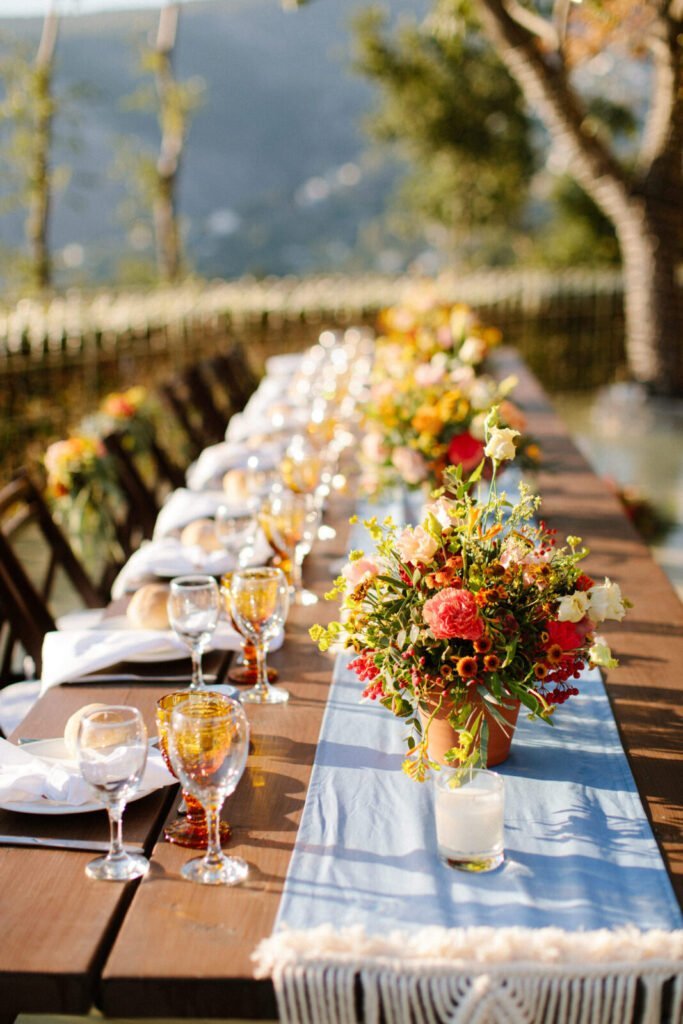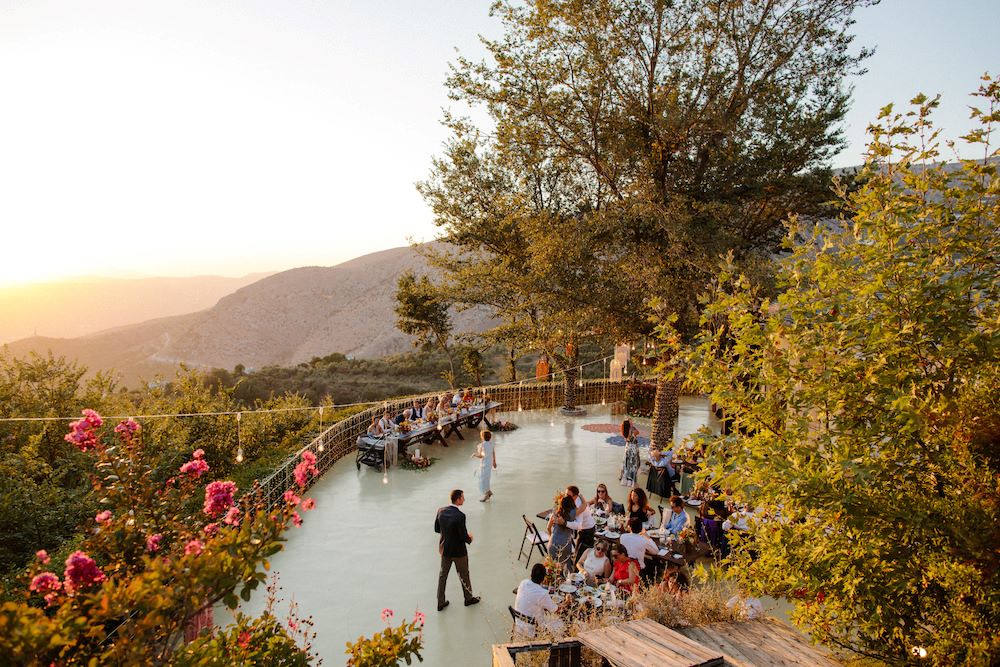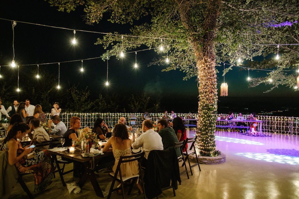 The reception just flowed in the outdoor space of Valeni Boutique Hotel & Spa, where a golden sunset and panoramic views over Volos created a romantic and magnificent backdrop for an evening of elegance and celebration. At this remarkable venue, tradition and modernity mix, weaving together scenes of stunning beauty. A beautifully designed seating board guided guests to their seats, as welcome drinks and elegant canapés were served in anticipation of the newlyweds. Ceramic vases overflowing with vibrant blooms dressed the wooden tables, covered with linen and dusty-blue runners. Macramé accents and embroidered napkins added an artisanal touch to the setting. The atmospheric lighting of Valeni, authentic Greek flavors, and a flower-adorned bar serving fresh cocktails infused the evening with festive jubilance. On the specially designed dance floor, Apostolia and Antonis celebrated beneath the lights, dancing the night away. One by one, guests and family joined in, and the evening evolved into a spirited celebration of love and togetherness.