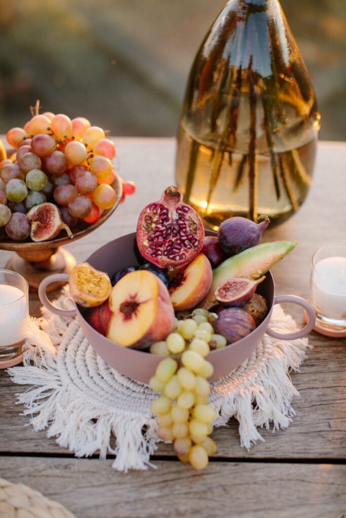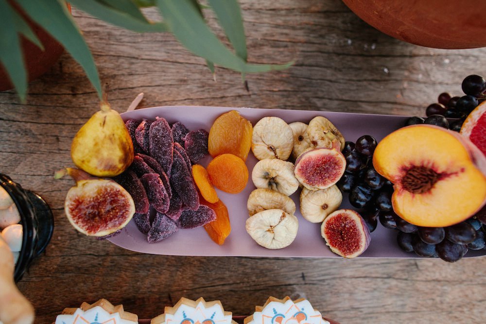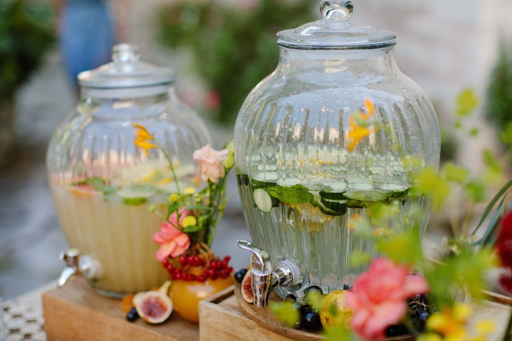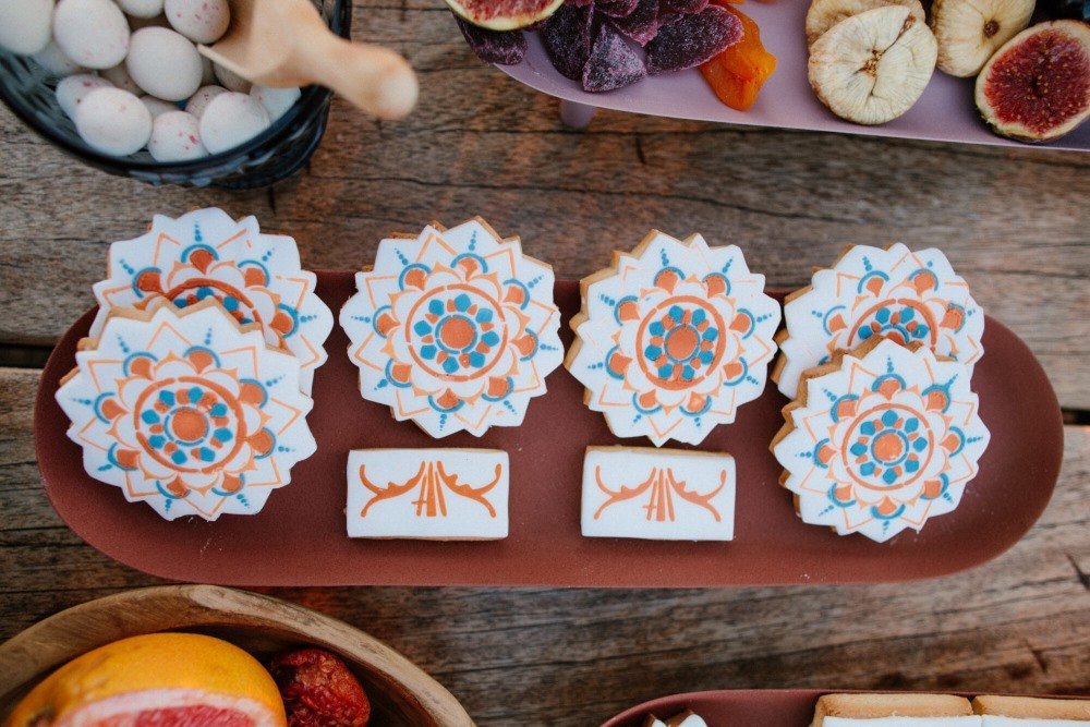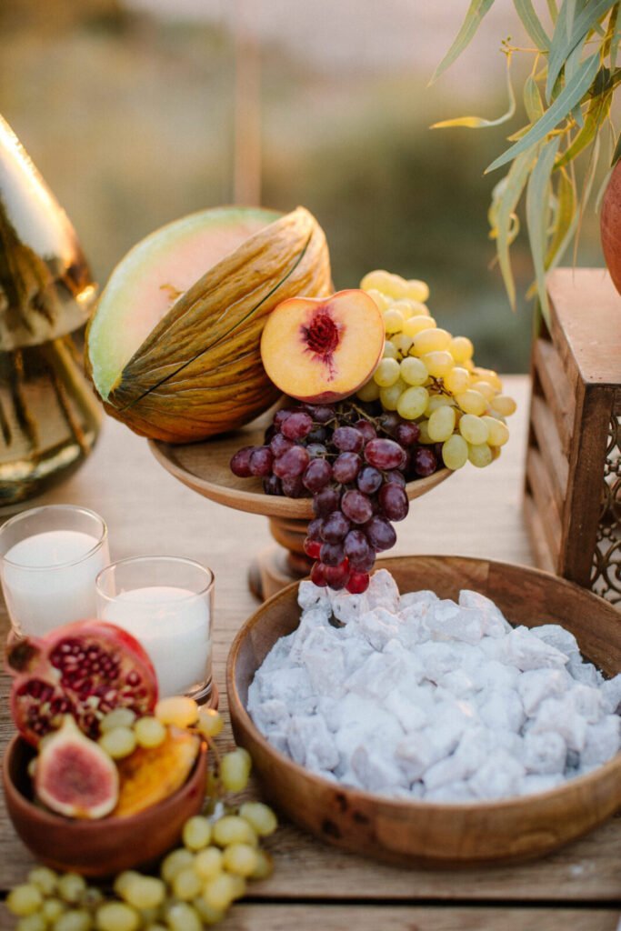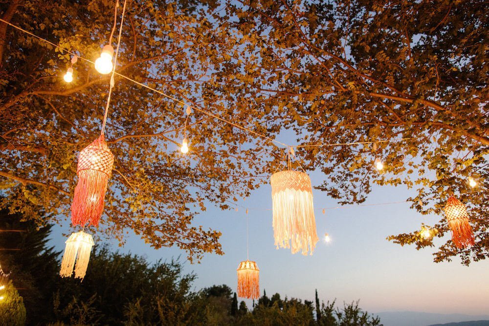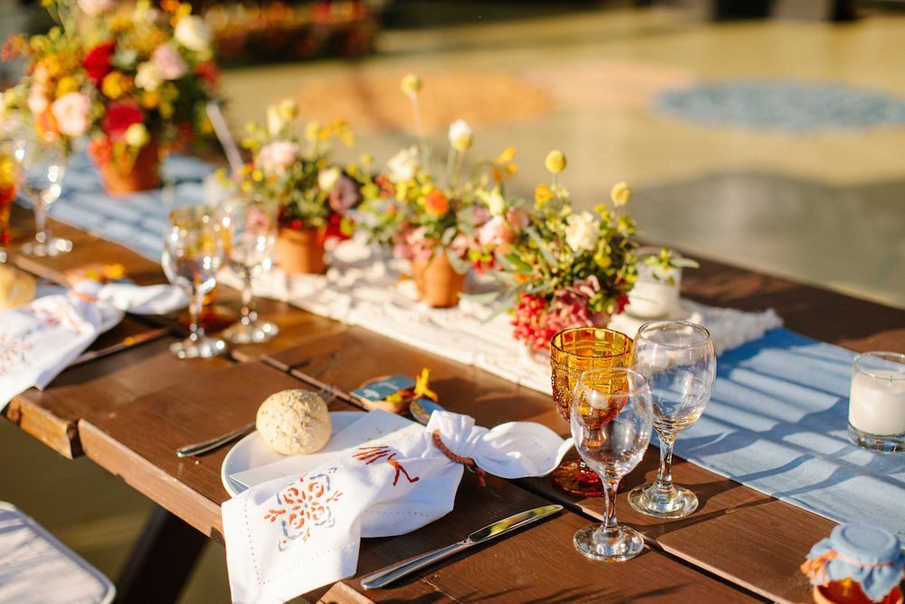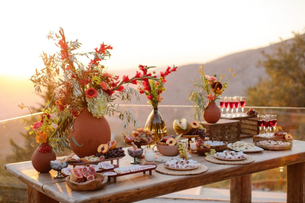 The reception just flowed in the outdoor space of Valeni Boutique Hotel & Spa, where a golden sunset and panoramic views over Volos created a romantic and magnificent backdrop for an evening of elegance and celebration. At this remarkable venue, tradition and modernity mix, weaving together scenes of stunning beauty. A beautifully designed seating board guided guests to their seats, as welcome drinks and elegant canapés were served in anticipation of the newlyweds. Ceramic vases overflowing with vibrant blooms dressed the wooden tables, covered with linen and dusty-blue runners. Macramé accents and embroidered napkins added an artisanal touch to the setting. The atmospheric lighting of Valeni, authentic Greek flavors, and a flower-adorned bar serving fresh cocktails infused the evening with festive jubilance. On the specially designed dance floor, Apostolia and Antonis celebrated beneath the lights, dancing the night away. One by one, guests and family joined in, and the evening evolved into a spirited celebration of love and togetherness.