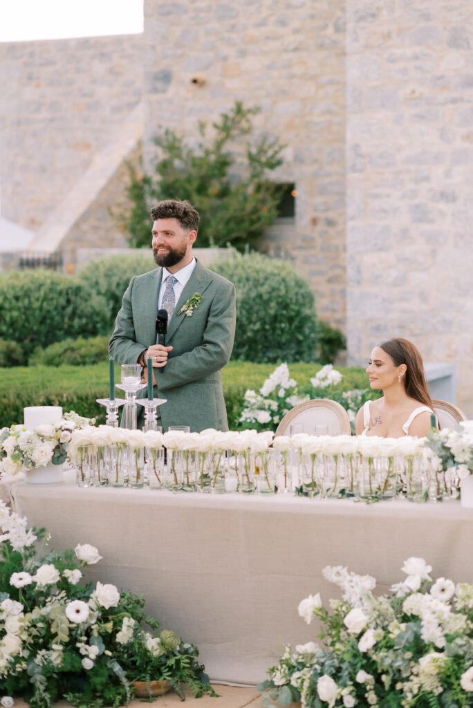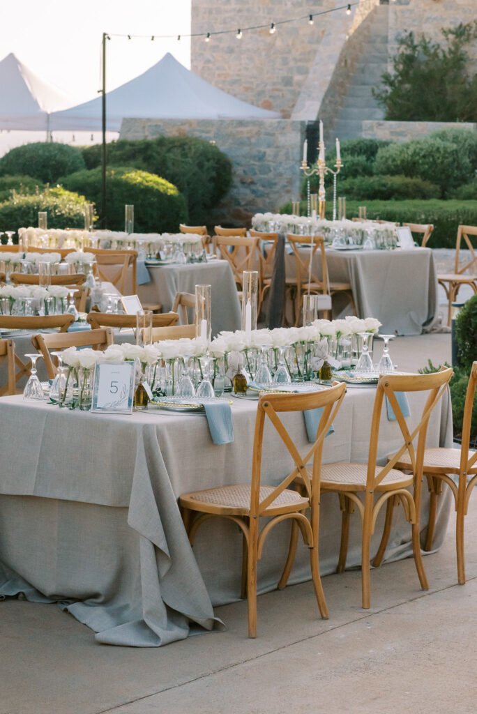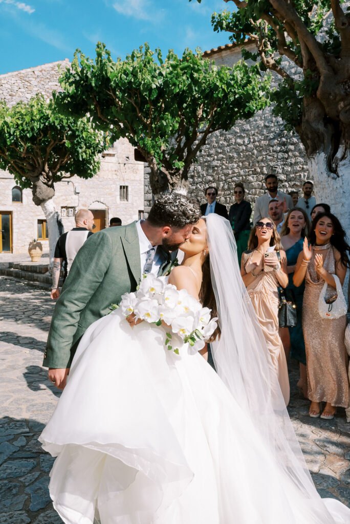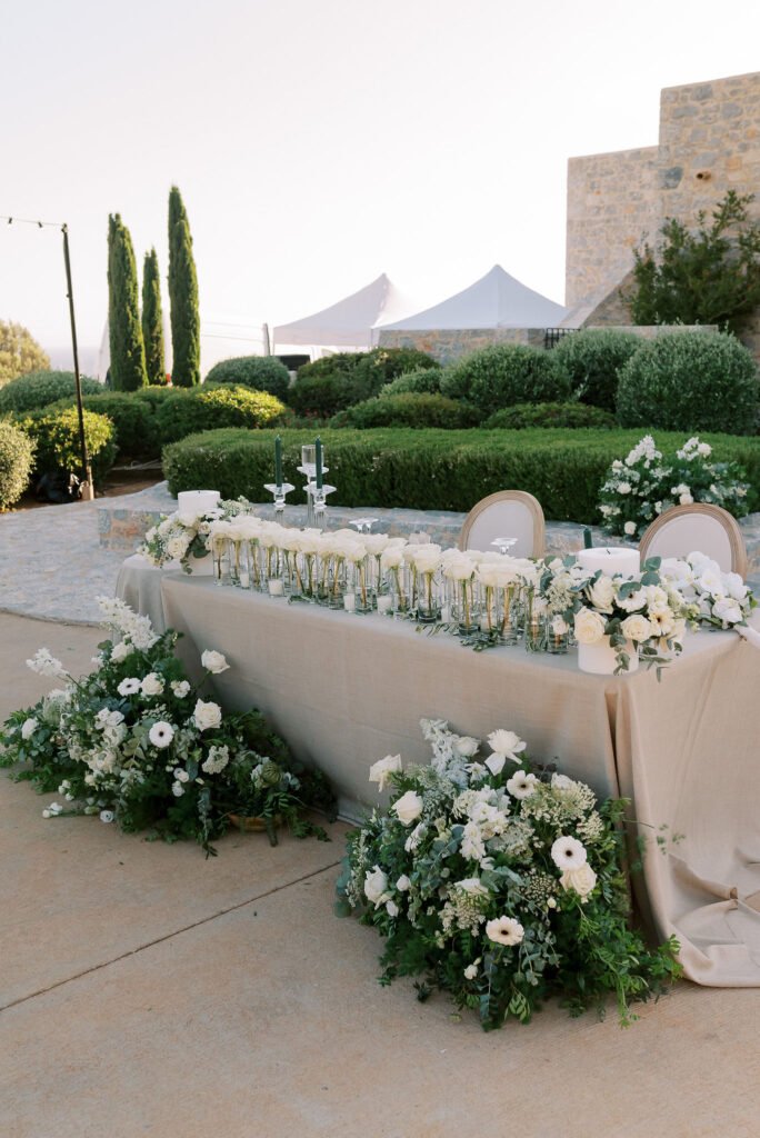 The event, designed by Golden Leaf Events, showcased the raw natural beauty of Mani, allowing the landscape itself to set the tone for the wedding celebration. The venue’s elegance was accentuated by the décor, with refined floral details that enhanced, rather than overpowered, the surroundings.