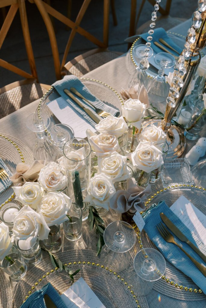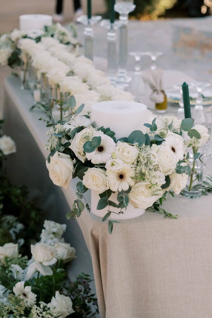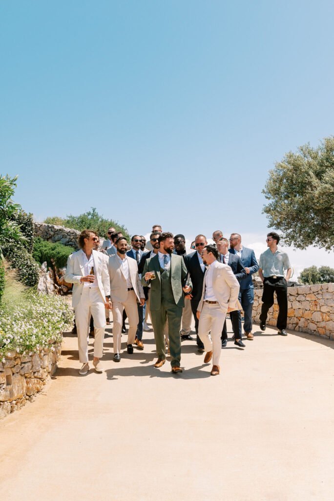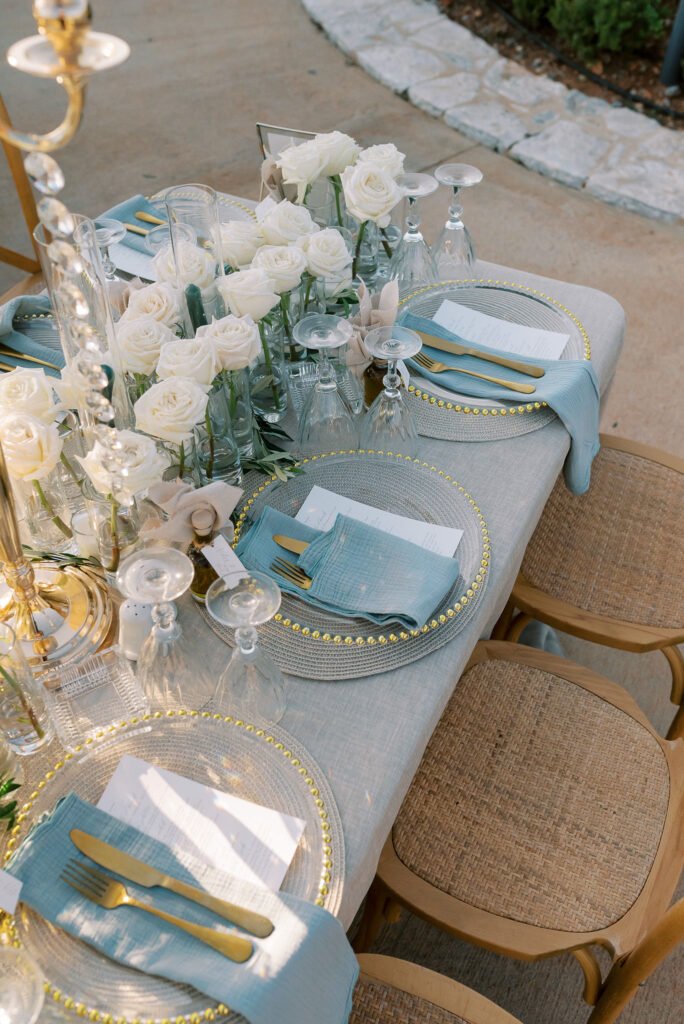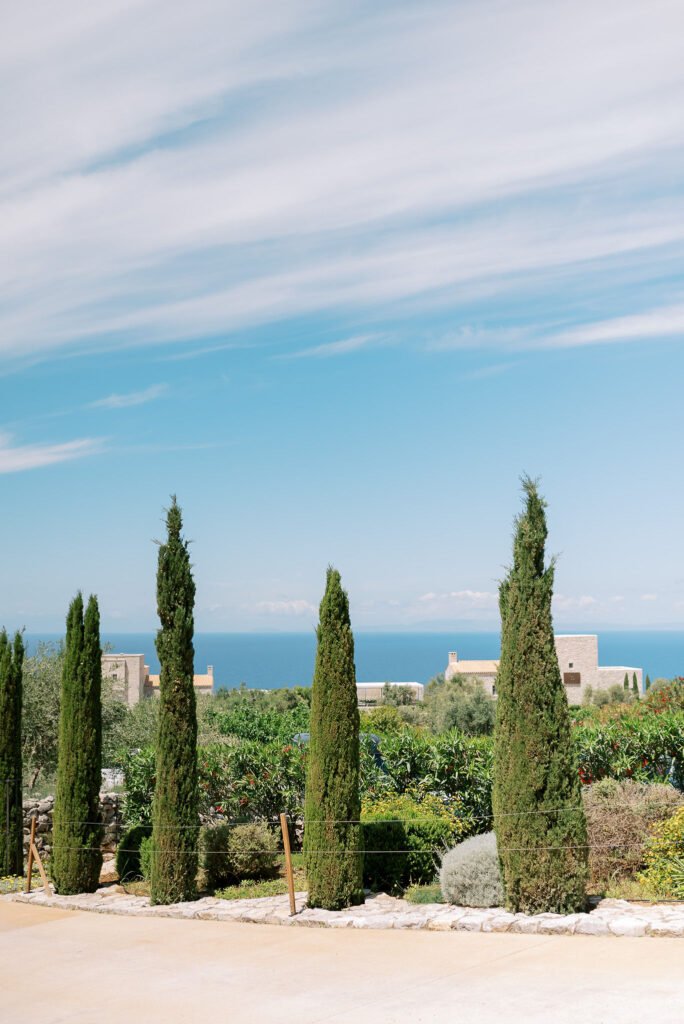 The event, designed by Golden Leaf Events, showcased the raw natural beauty of Mani, allowing the landscape itself to set the tone for the wedding celebration. The venue’s elegance was accentuated by the décor, with refined floral details that enhanced, rather than overpowered, the surroundings.