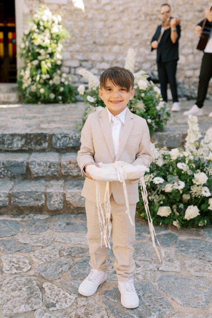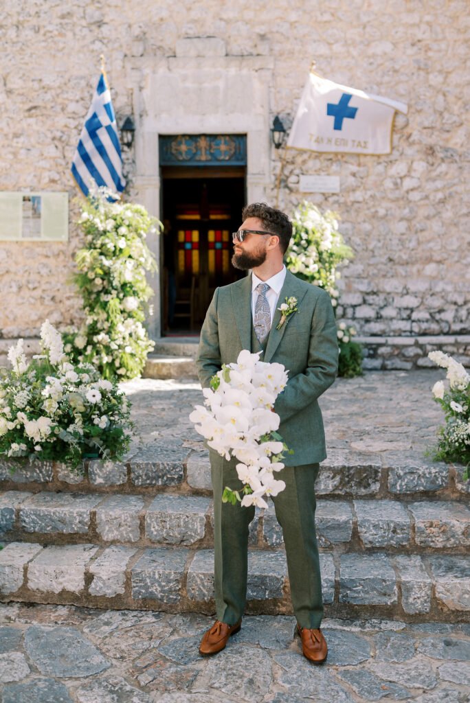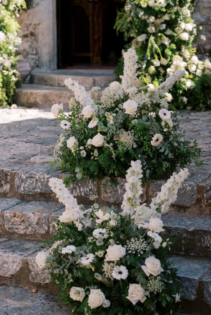Soft florals in shades of white and ivory created a cohesive visual narrative throughout the day. Roses, orchids and delicate seasonal blooms adorned the church, the ceremony setting and the reception tables, adding a strong sense of finesse to the stone architecture and natural textures of the venue. The bride carried an exquisite cascading bouquet of white orchids, a statement piece that complemented the elegance of her wedding dress and the overall aesthetic of the celebration.