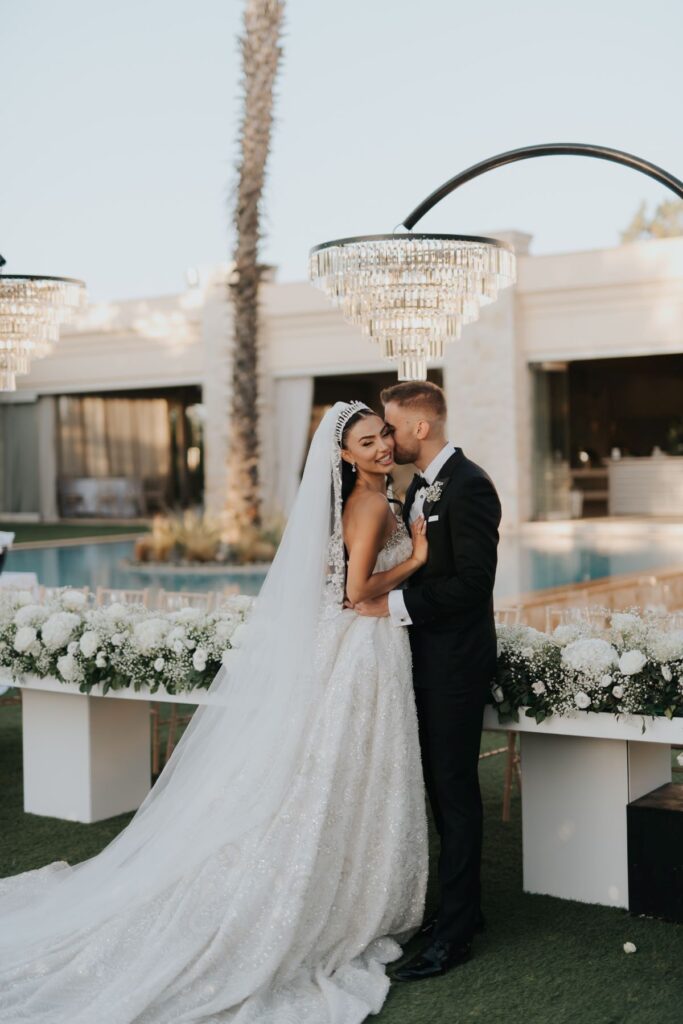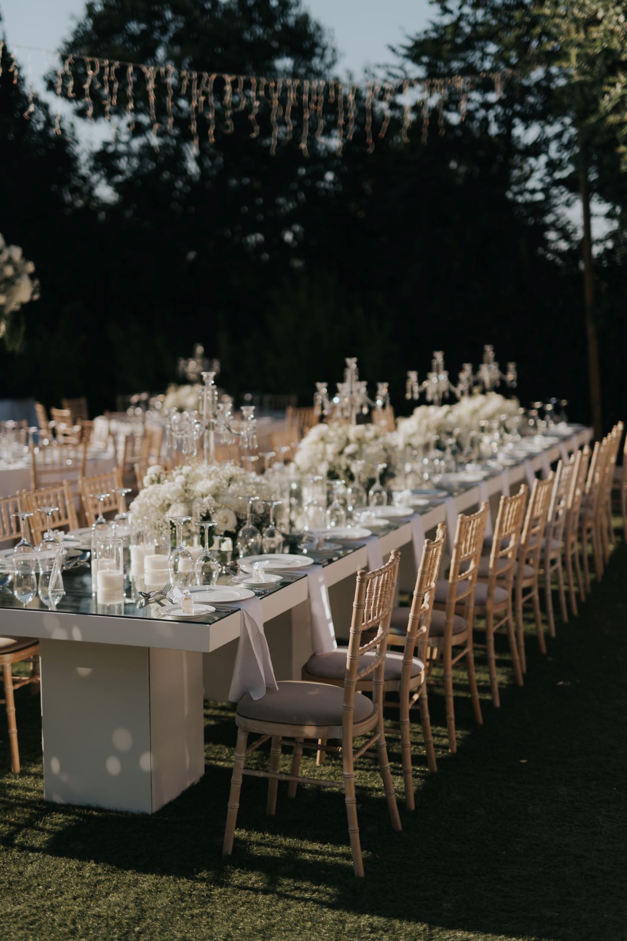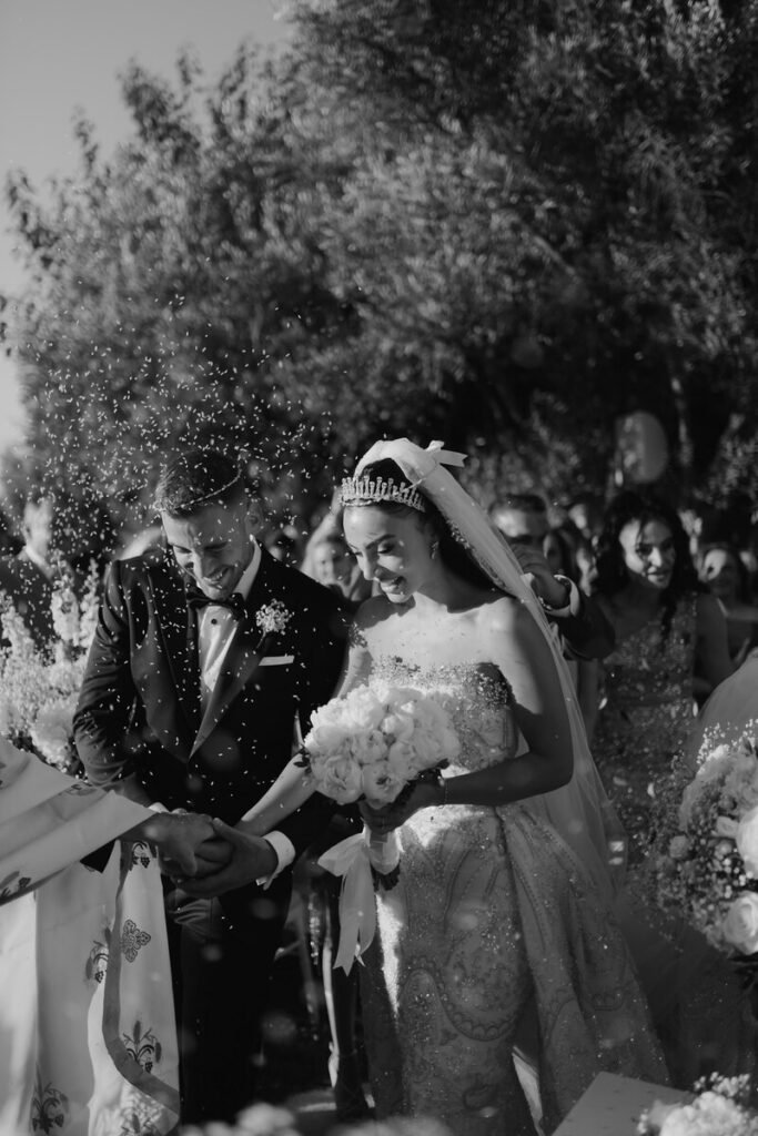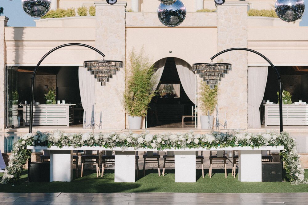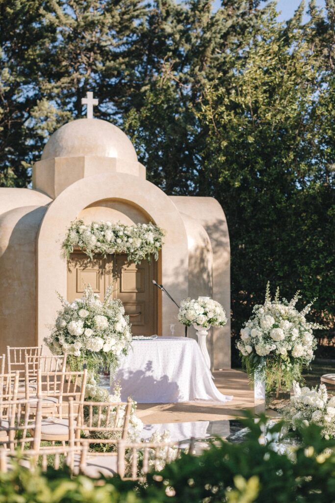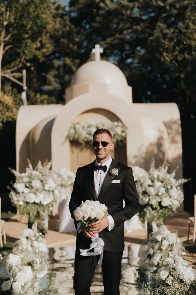 Set against the natural beauty of Ktima Orizontes, the ceremony unfolded at the estate’s adorable chapel, where minimal architecture was accentuated by luxurious floral artistry. Fevronia Luxury Concepts opted for a timeless all-white palette- soft hues, organic textures, and sculptural arrangements that exuded all-out luxury.