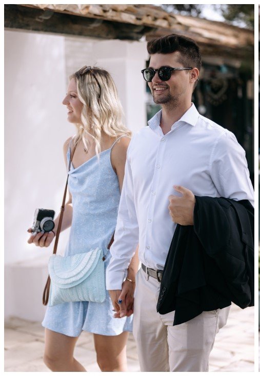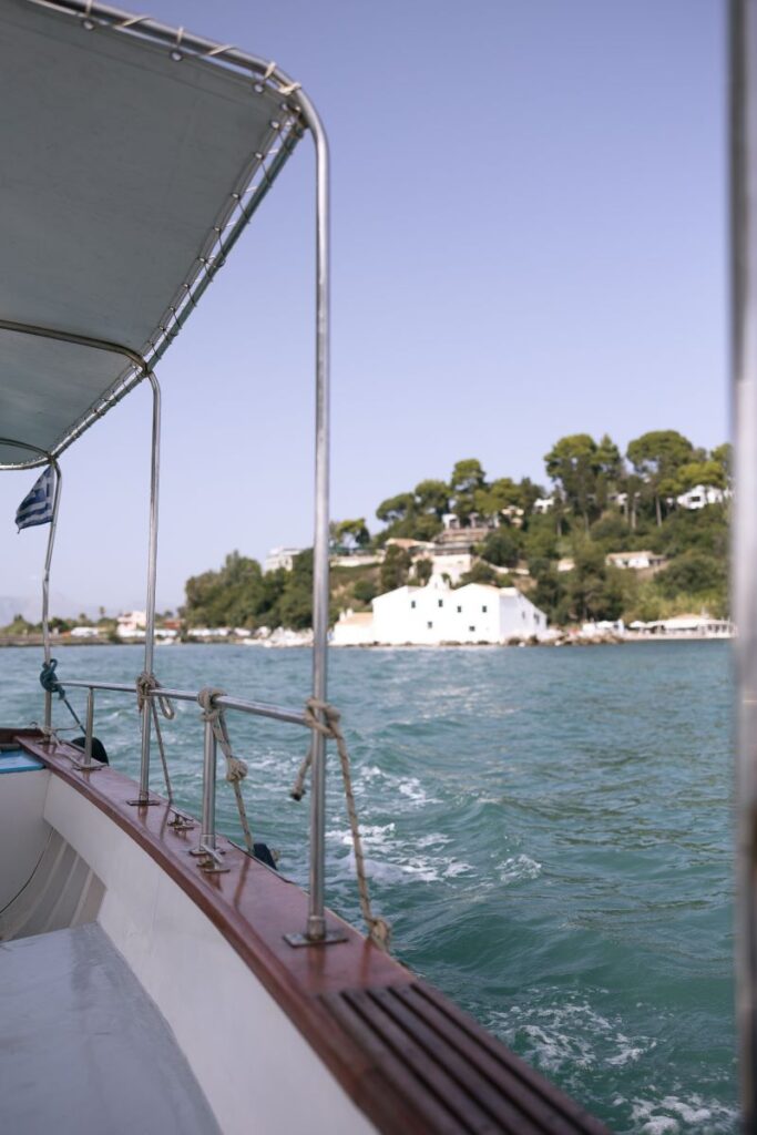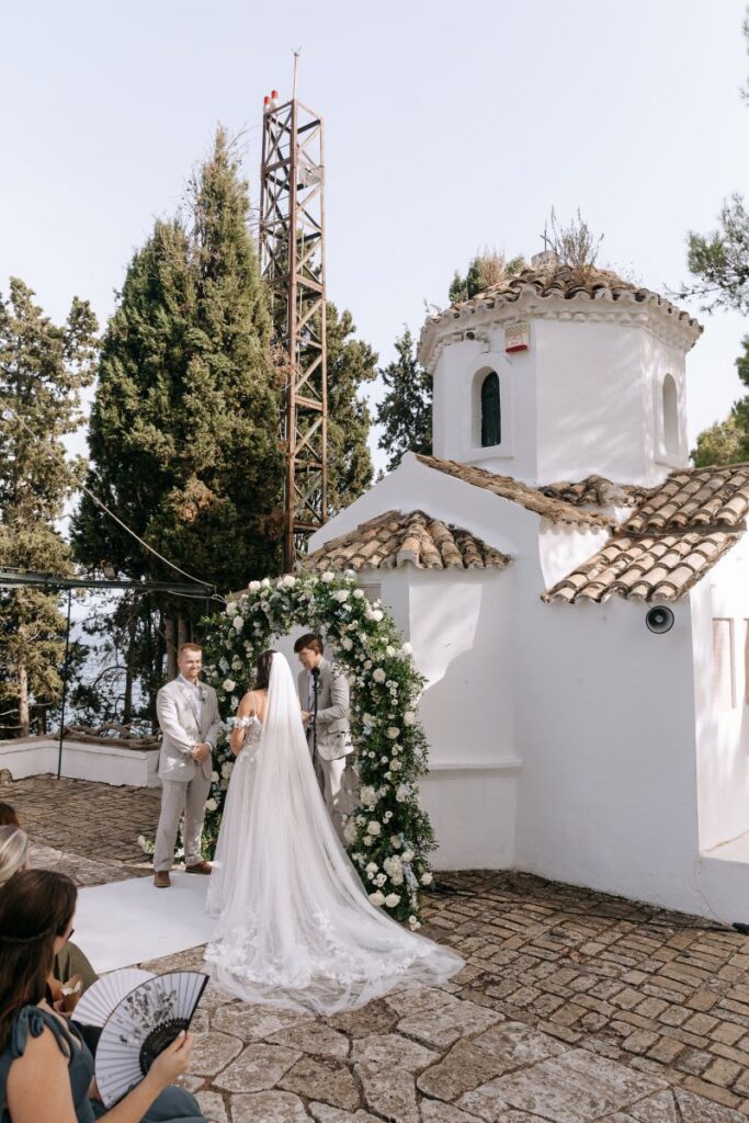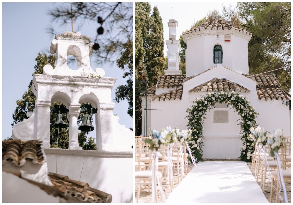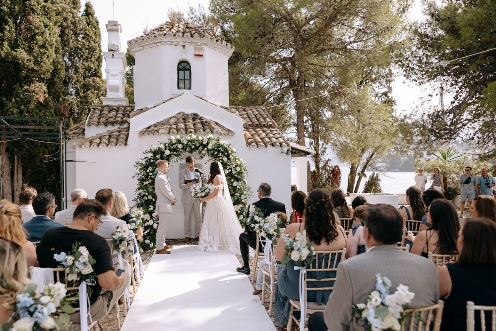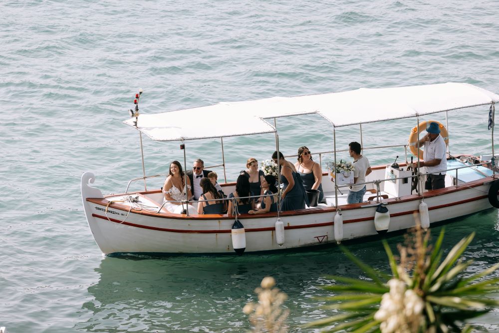 Corfu, with its regal beauty and idyllic landscapes, is often the ultimate destination for a dream wedding. Whether exchanging vows in a traditional city church against the backdrop of a renowned landmark or at a quaint seaside chapel, the island offers countless romantic options. For Juliana and Eric, the setting was the picturesque Church of the Transfiguration of the Savior (Metamorfosis Tou Sotiros) on Pontikonisi. The bride arrived elegant and radiant, gliding across the water with her family.