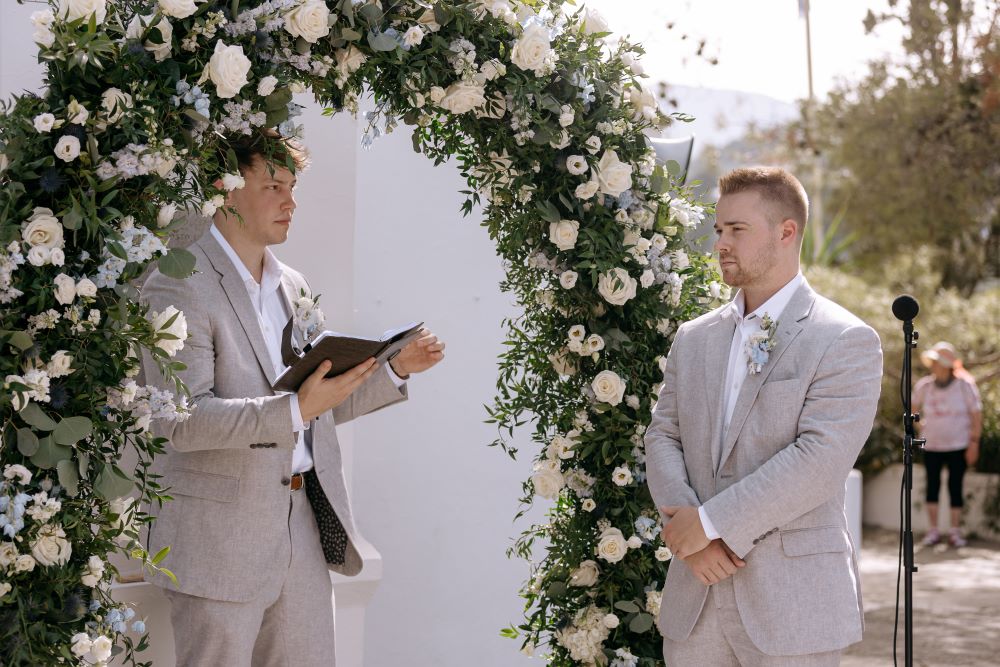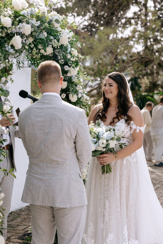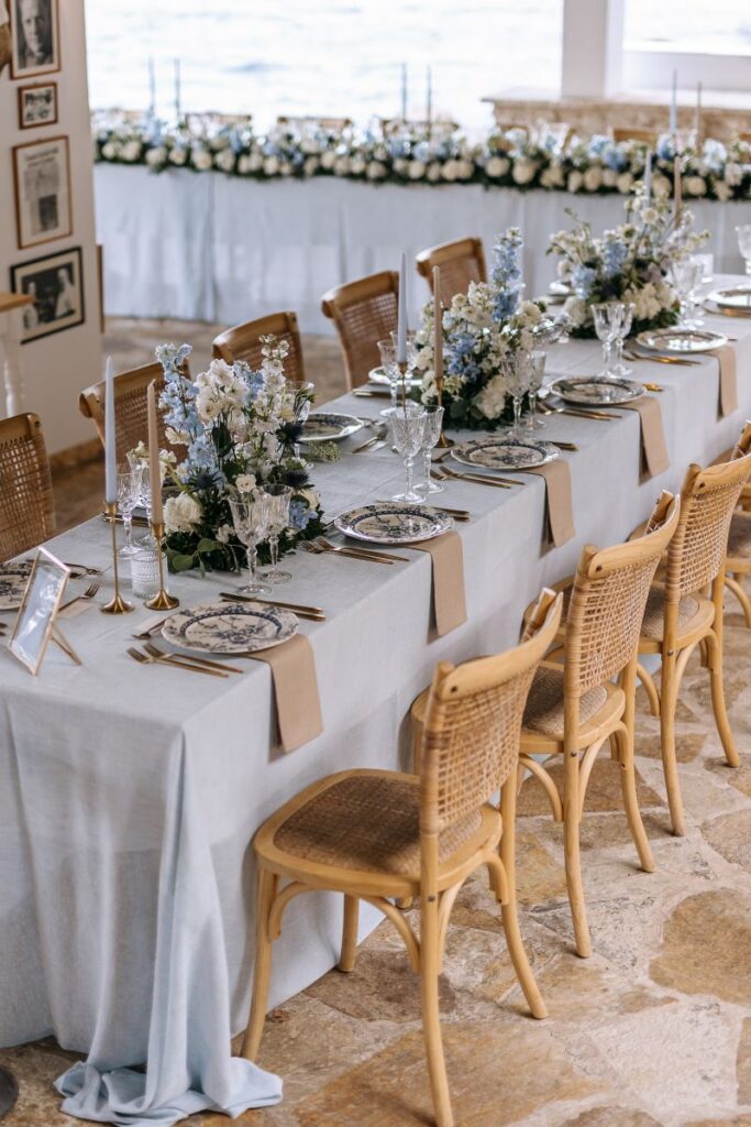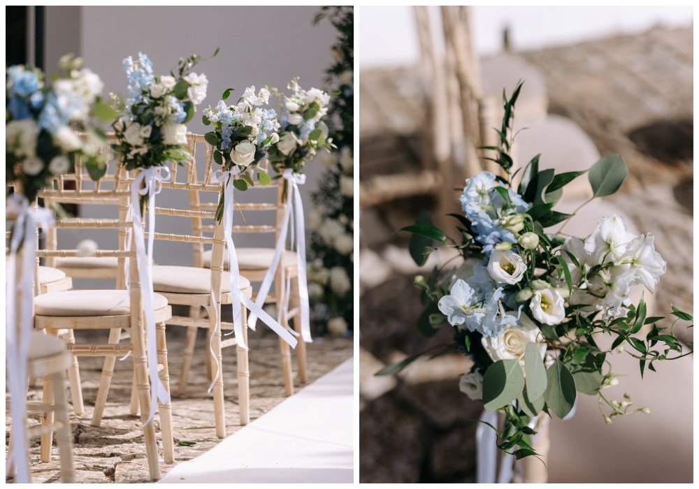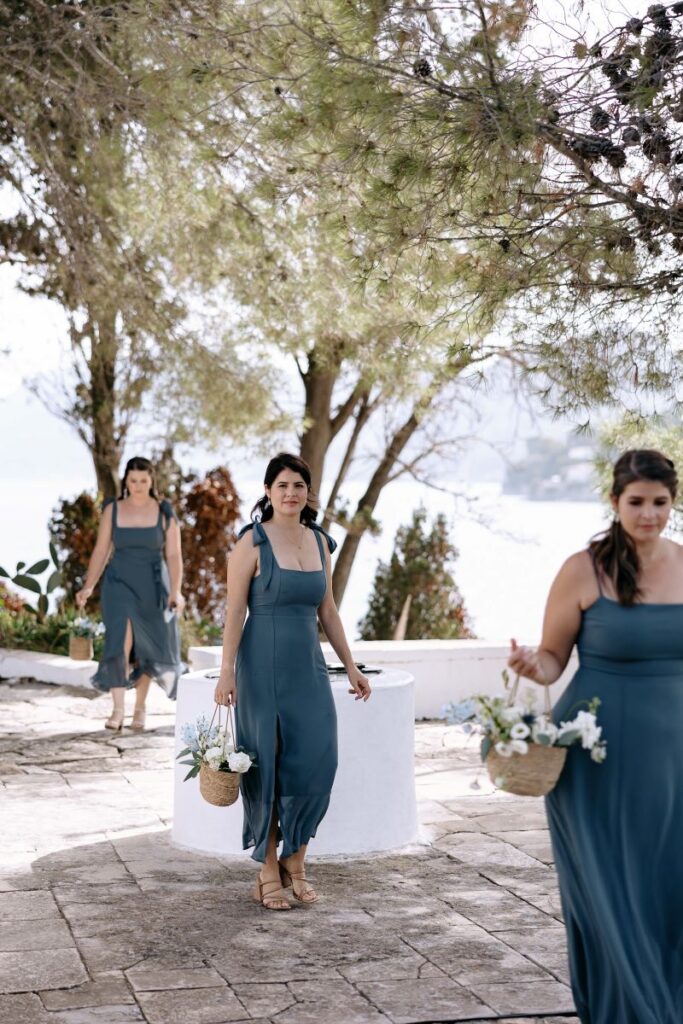Under a floral arch by Rizos Garden, adorned with stunning white and baby blue blooms, the couple exchanged vows surrounded by their closest family and friends. The romantic setting was accentuated by the bridesmaids wearing deep sea hues, holding baskets filled with matching flowers, and the groomsmen attired in sandy beige tones, creating a harmonious and elegant palette.