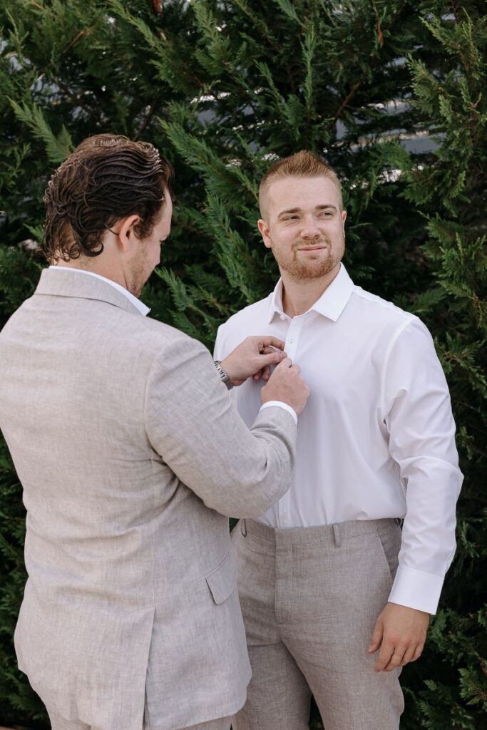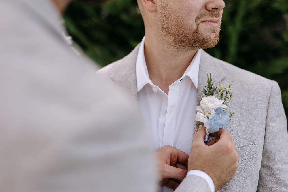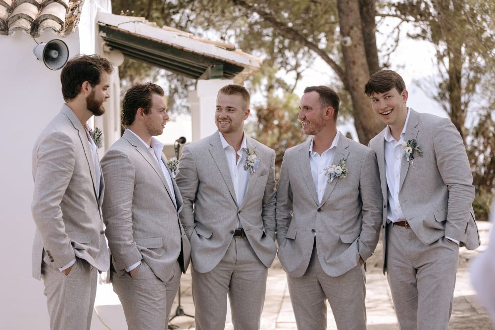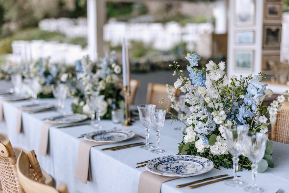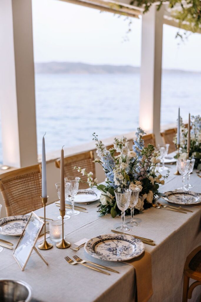 Under a floral arch by Rizos Garden, adorned with stunning white and baby blue blooms, the couple exchanged vows surrounded by their closest family and friends. The romantic setting was accentuated by the bridesmaids wearing deep sea hues, holding baskets filled with matching flowers, and the groomsmen attired in sandy beige tones, creating a harmonious and elegant palette.