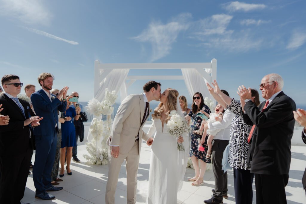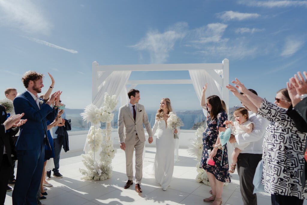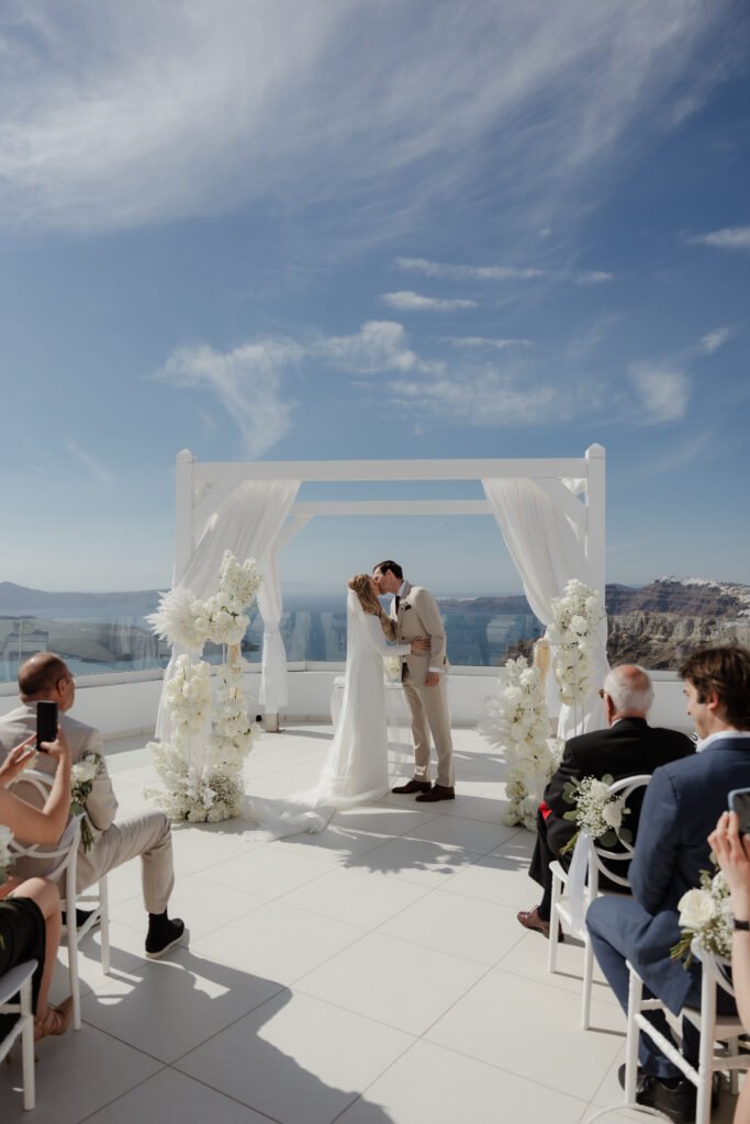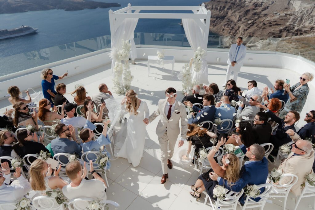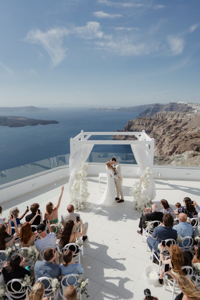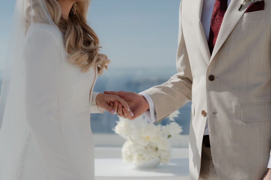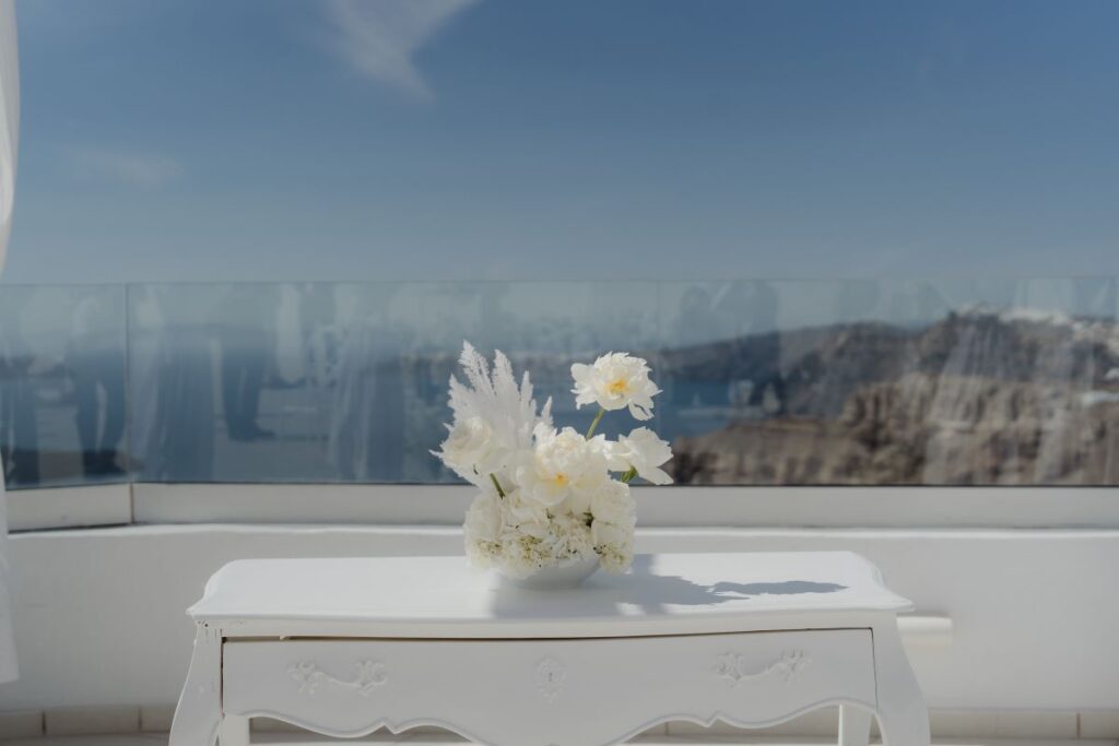 The reception that followed, curated by Spicy Bites Catering, highlighted contemporary Mediterranean flavors that perfectly matched the overall aesthetic. In the meantime, the atmosphere, joyful and bubbly at first, soon evolved into a high-spirited celebration.  Dreamodd Photography, captured the day, freezing the blissful moments through images that focus on expression and sentiment,  preserving this Santorini wedding to be treasured for a lifetime.