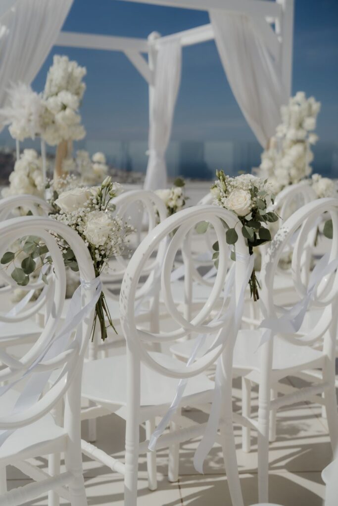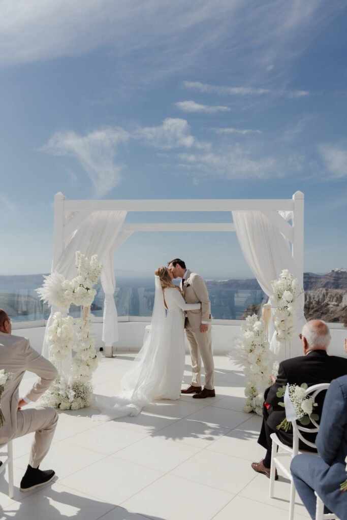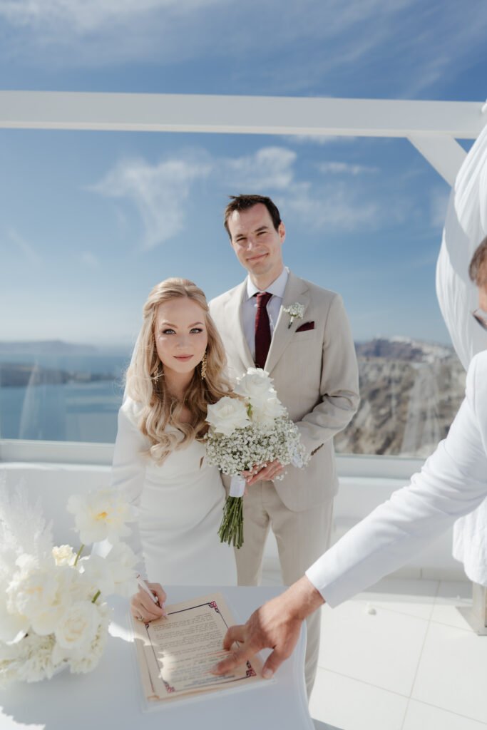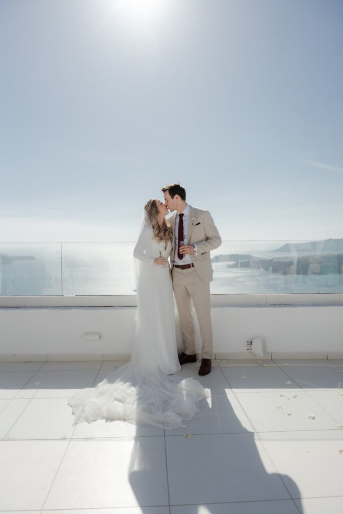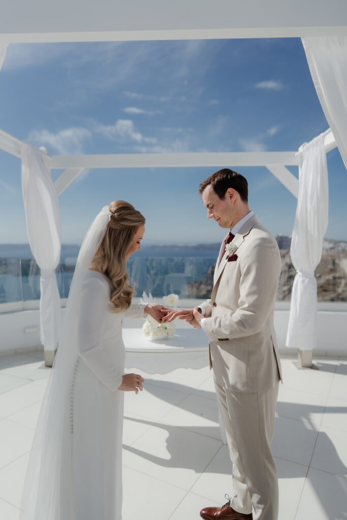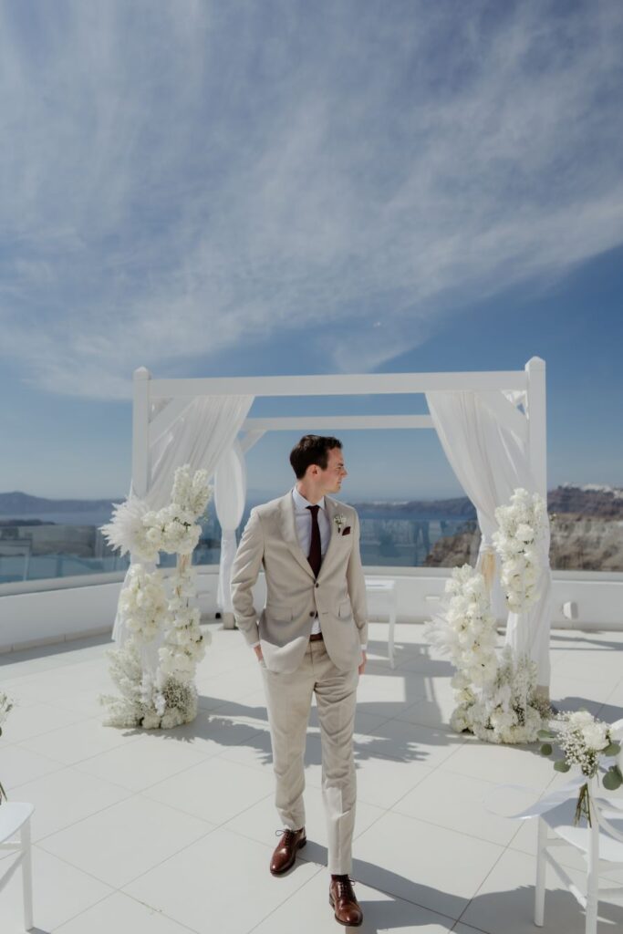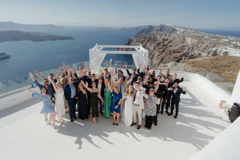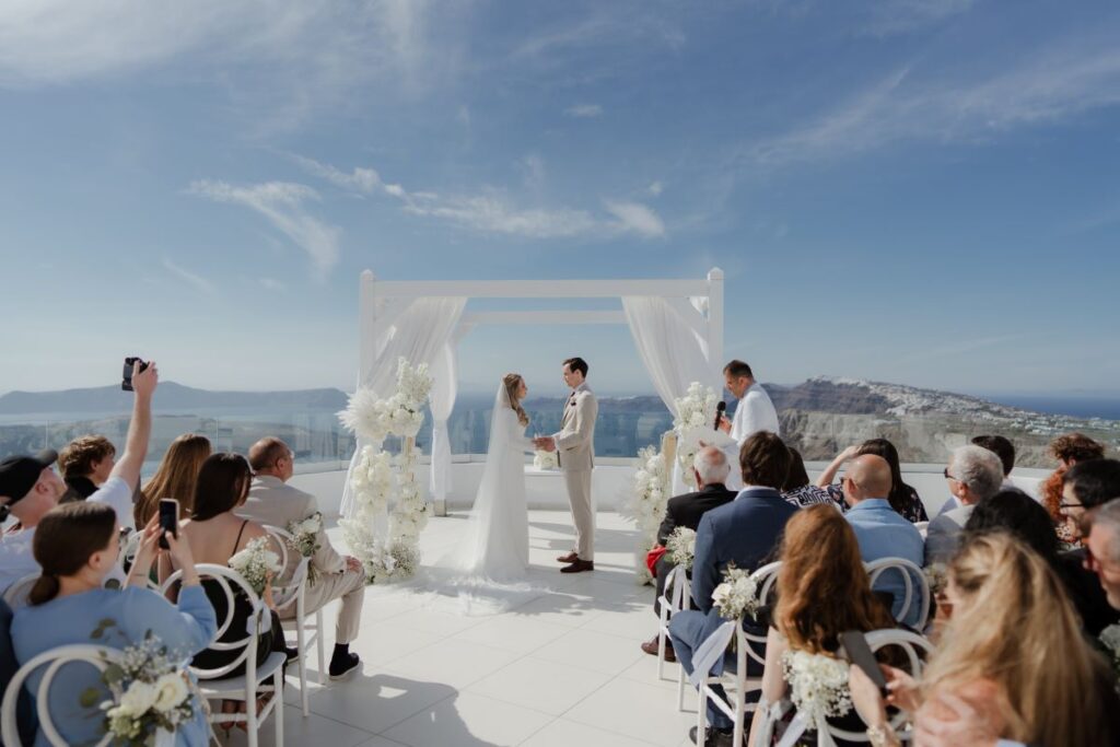 The reception that followed, curated by Spicy Bites Catering, highlighted contemporary Mediterranean flavors that perfectly matched the overall aesthetic. In the meantime, the atmosphere, joyful and bubbly at first, soon evolved into a high-spirited celebration.  Dreamodd Photography, captured the day, freezing the blissful moments through images that focus on expression and sentiment,  preserving this Santorini wedding to be treasured for a lifetime.