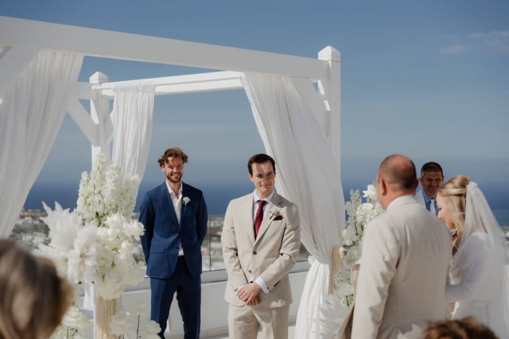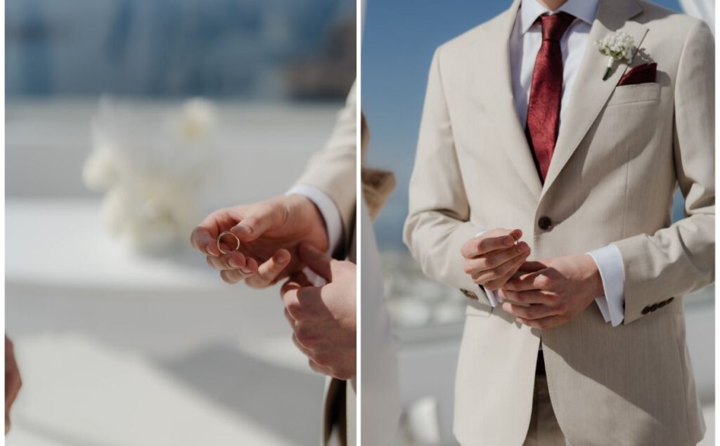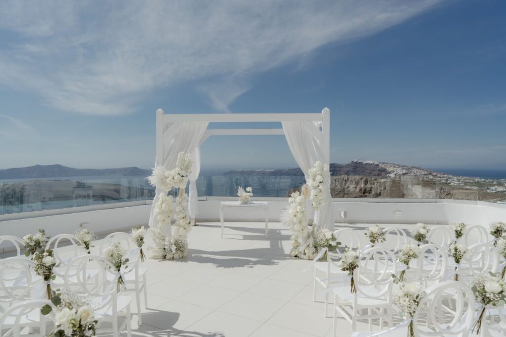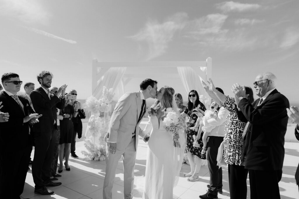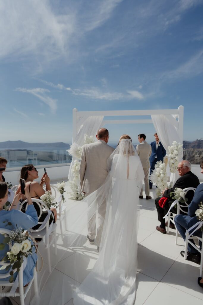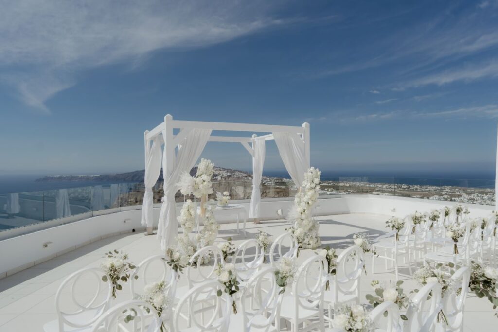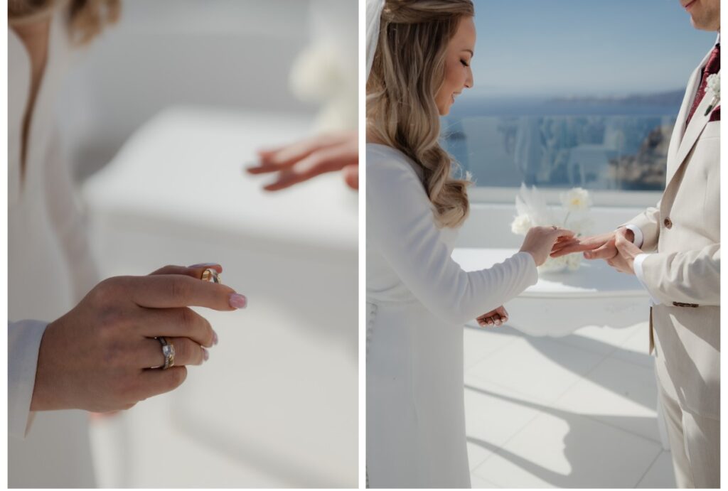The reception that followed, curated by Spicy Bites Catering, highlighted contemporary Mediterranean flavors that perfectly matched the overall aesthetic. In the meantime, the atmosphere, joyful and bubbly at first, soon evolved into a high-spirited celebration.  Dreamodd Photography, captured the day, freezing the blissful moments through images that focus on expression and sentiment,  preserving this Santorini wedding to be treasured for a lifetime.