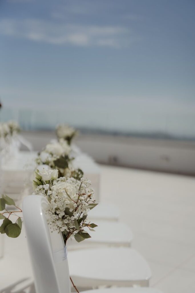 Lavish Affairs, who planned and organised the event, brought the couple’s dream to life with an elegant, all-white aesthetic. Delicate roses, baby’s breath and soft greenery embellished the wide balcony, adding texture and refinement to the wedding scene.
