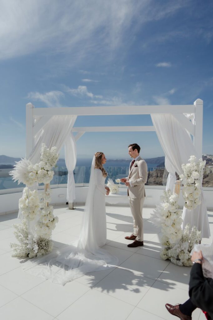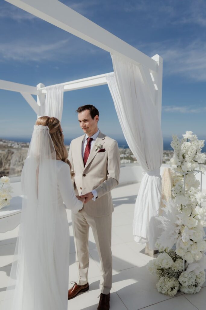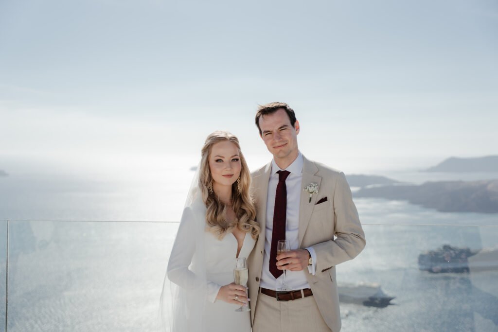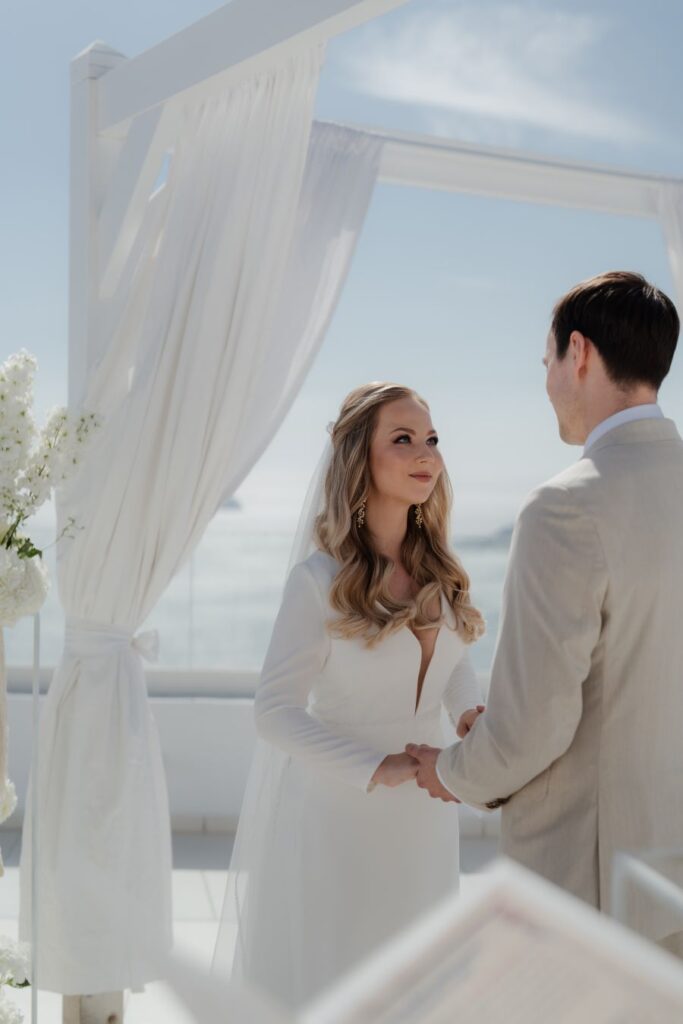 Maria and Jasper who reside in England – Maria half Greek, half Russian, and Jasper Dutch -were married in one of the world’s most iconic and cosmopolitan settings, Santorini. They chose Santo Wines for both their ceremony and reception, a distinguished winery and one of Santorini’s most sought-after venues.