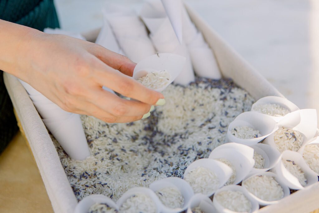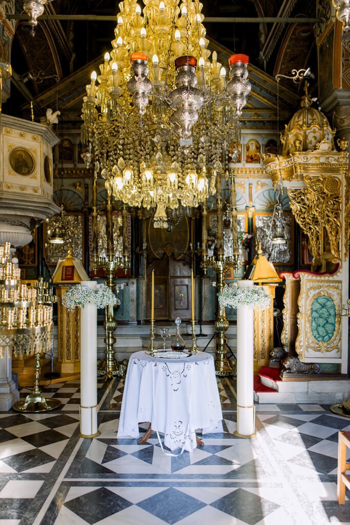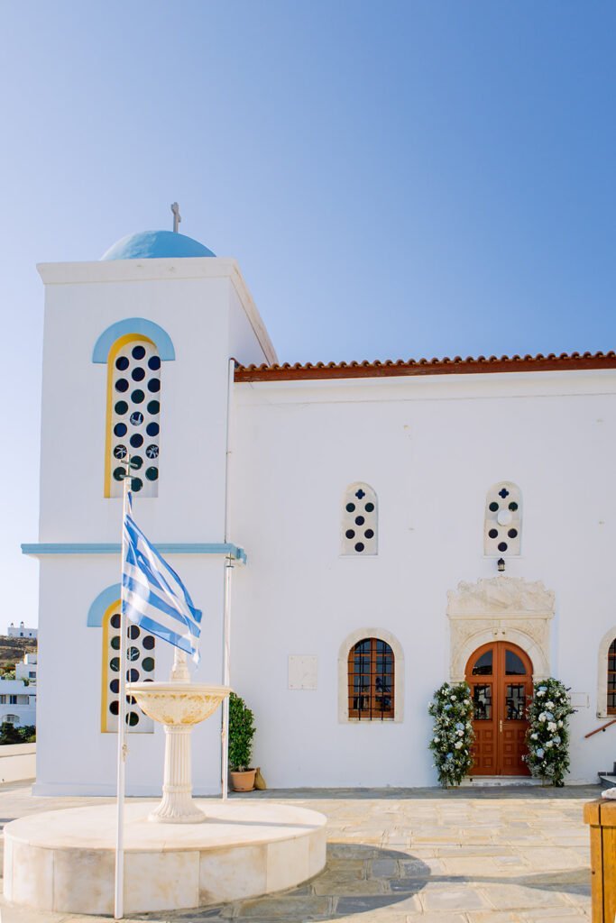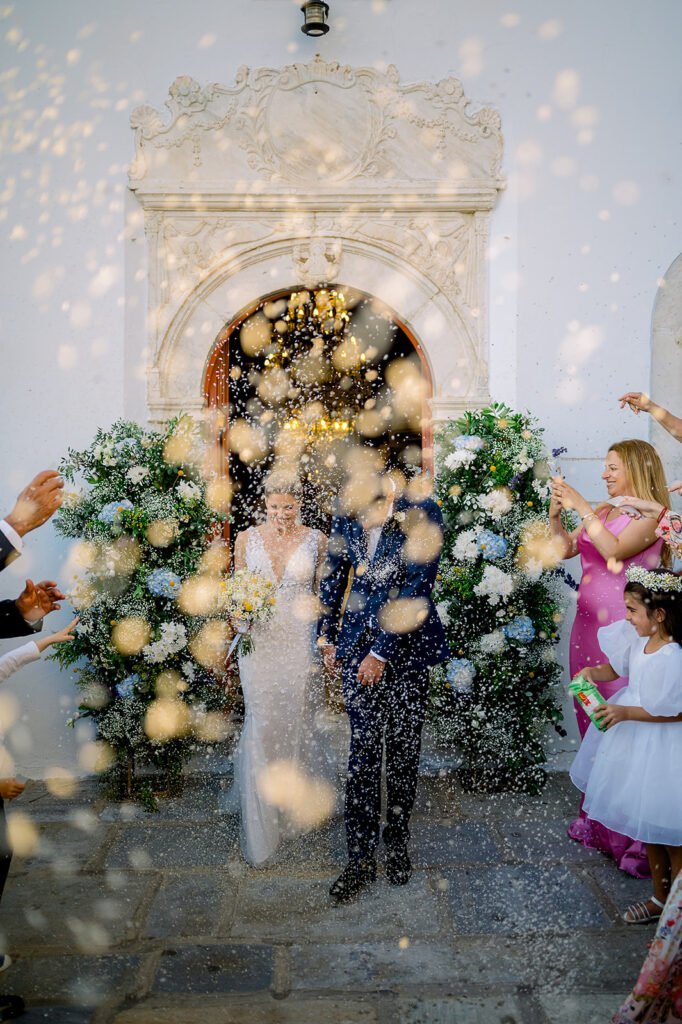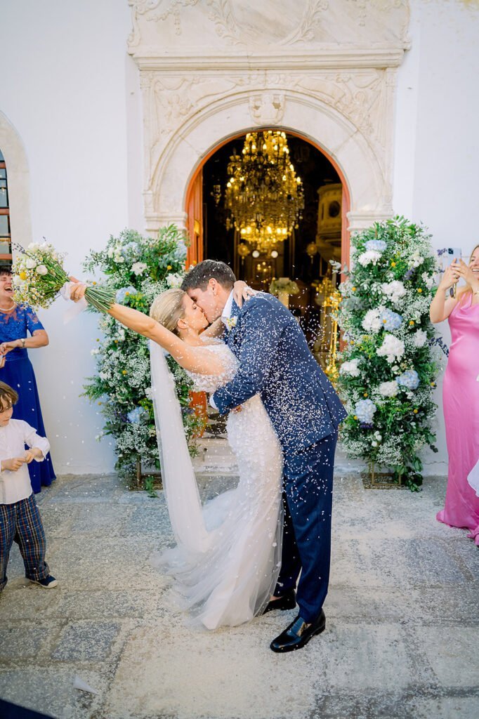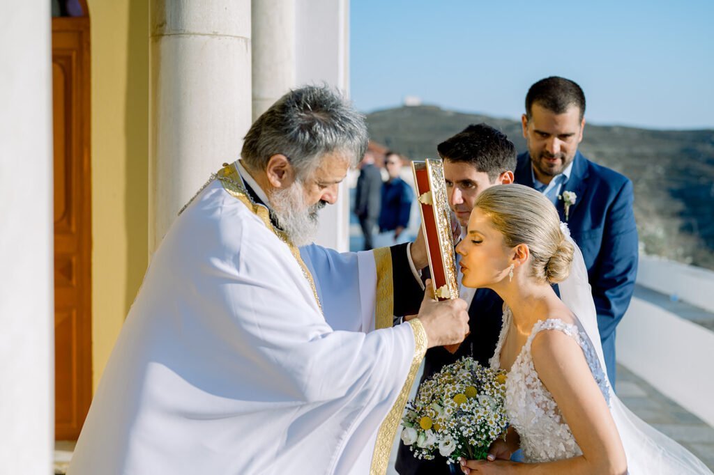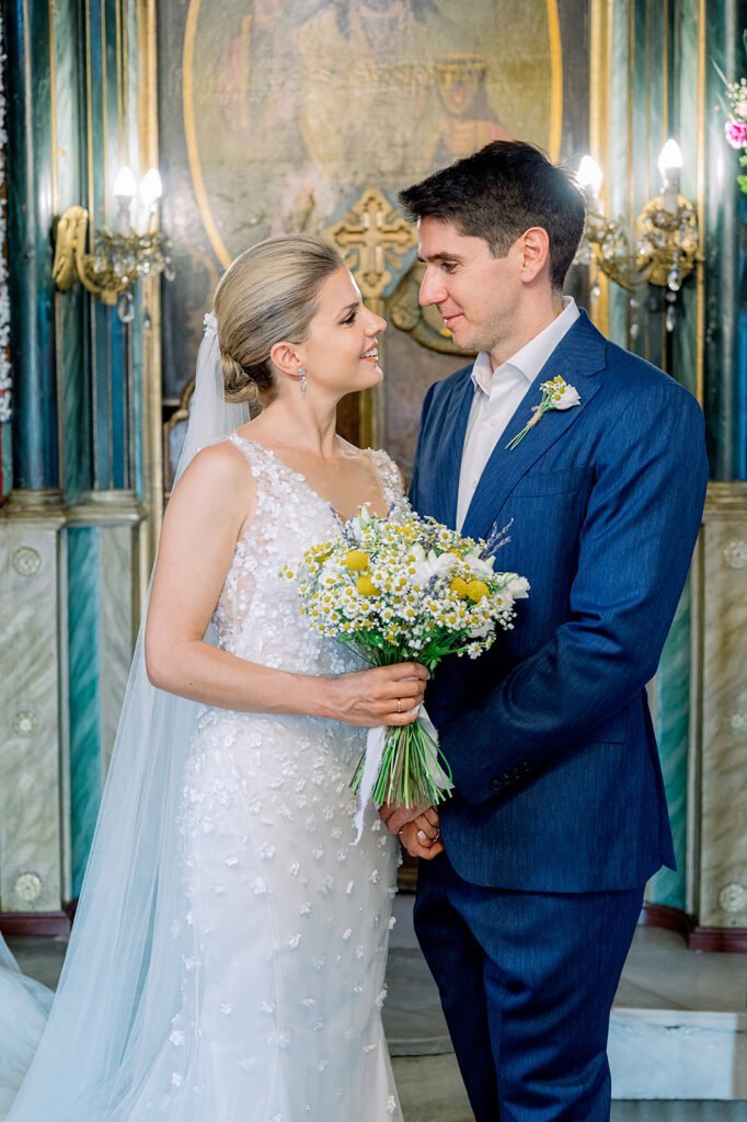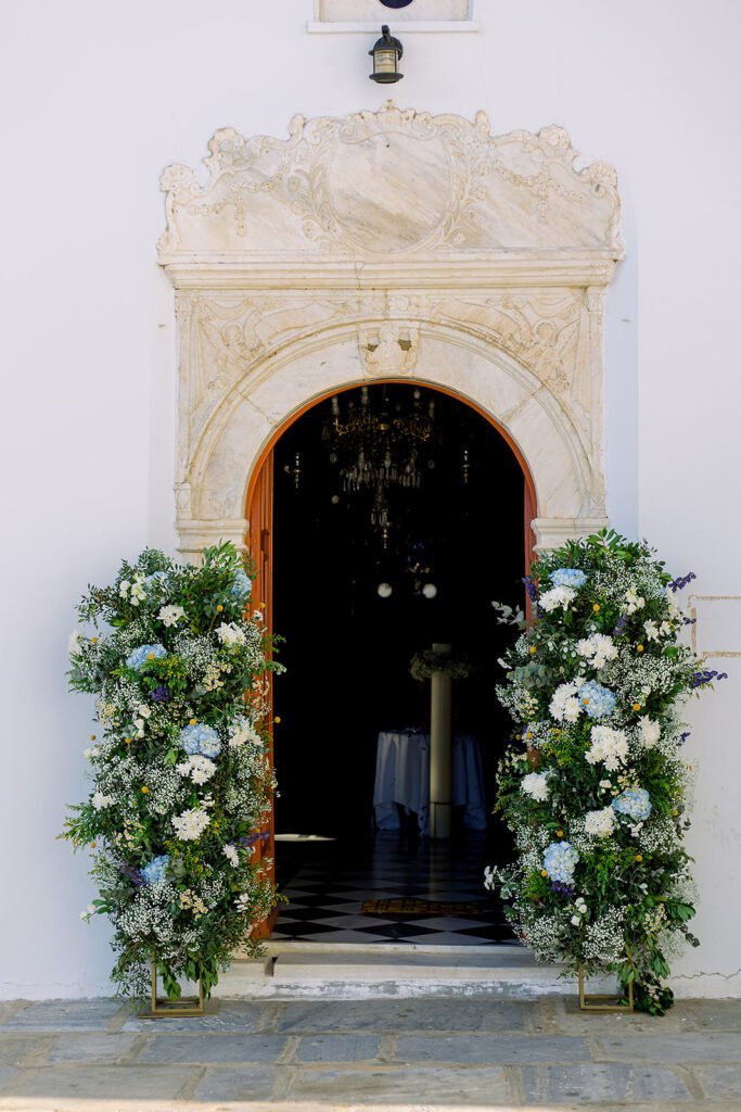 The Orthodox ceremony took place at a picturesque, coastal whitewashed church, the Presentation of Our Lord at the Temple (Ypapanti tou Kyriou) in the village of Ktikados. Its impressive entrance was adorned with two abundant floral compositions of lush greenery, white blooms, and soft blue hydrangeas, which were perfectly complemented by chamomile and lavender. The floral arrangements, designed by Levanta Events, captured the essence of Tinos’ natural beauty, bringing the countryside and the island’s nature-loving spirit to the forefront of the celebration. The bride’s fragrant bouquet released its soft aromas with her every movement