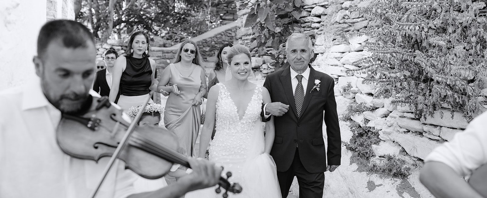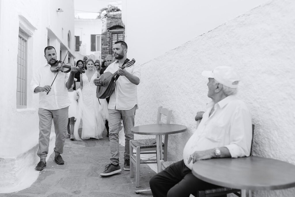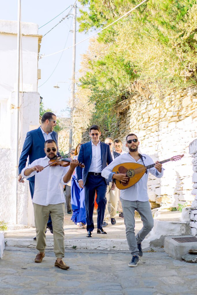 In keeping with a tradition dating back to Ancient Greece and the Byzantine era, live musicians led the bride and groom to the church, separately, each accompanied by their families and friends through Tinos’ narrow marble alleys. The festive sound of the violin and lute signalled the happy event and the couple’s procession to the church, blending celebration with heritage in a way only the Greek islands can offer.