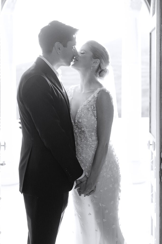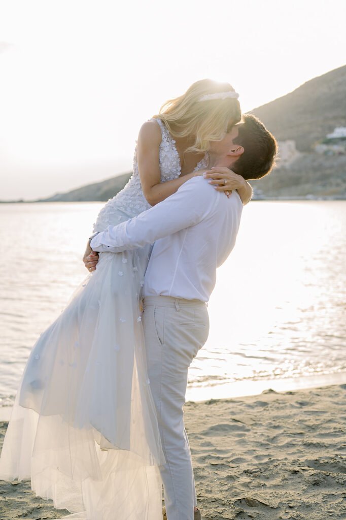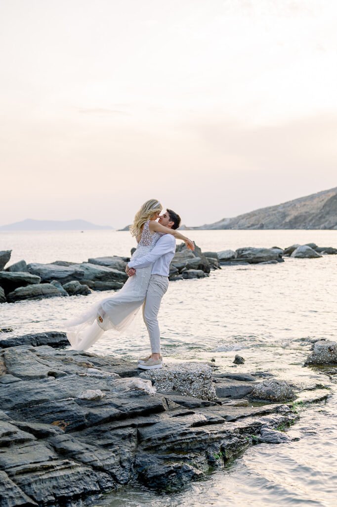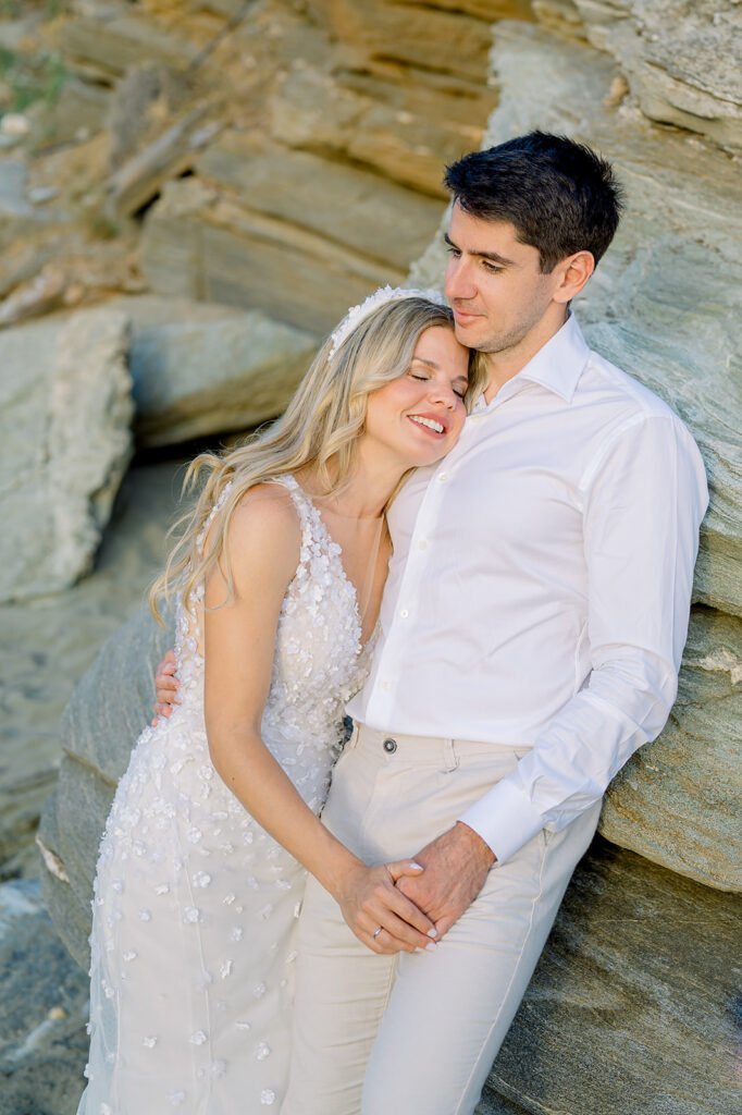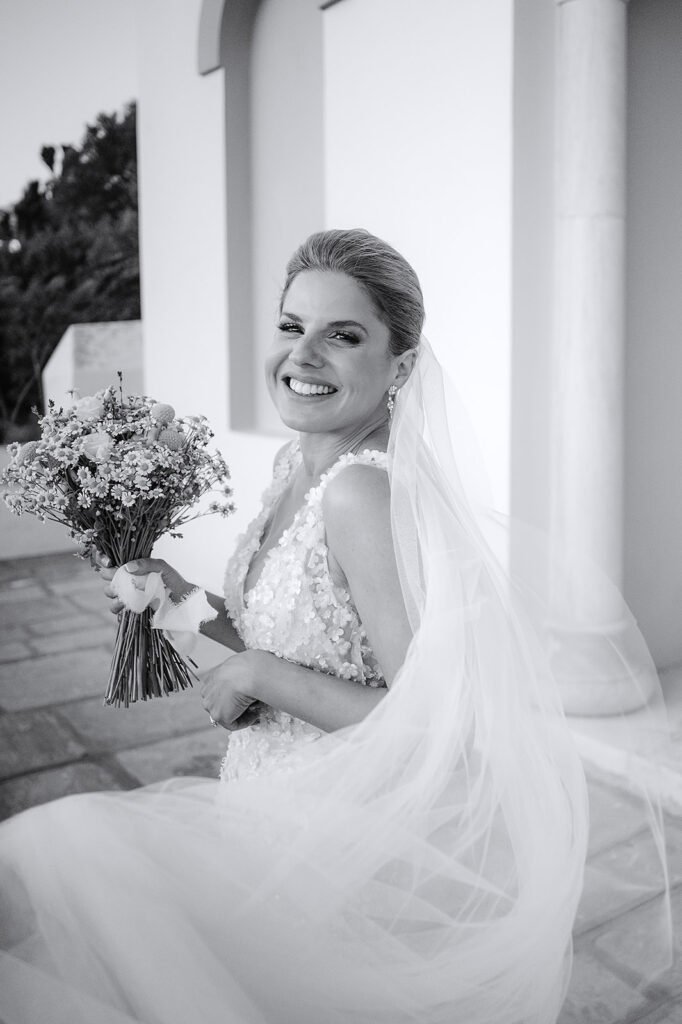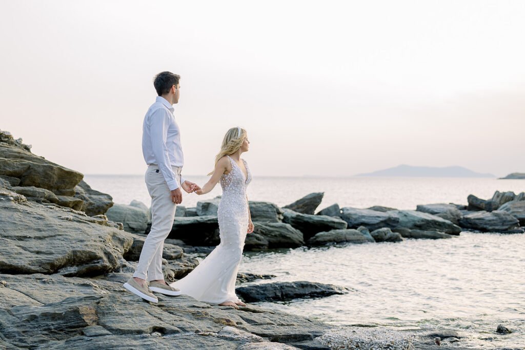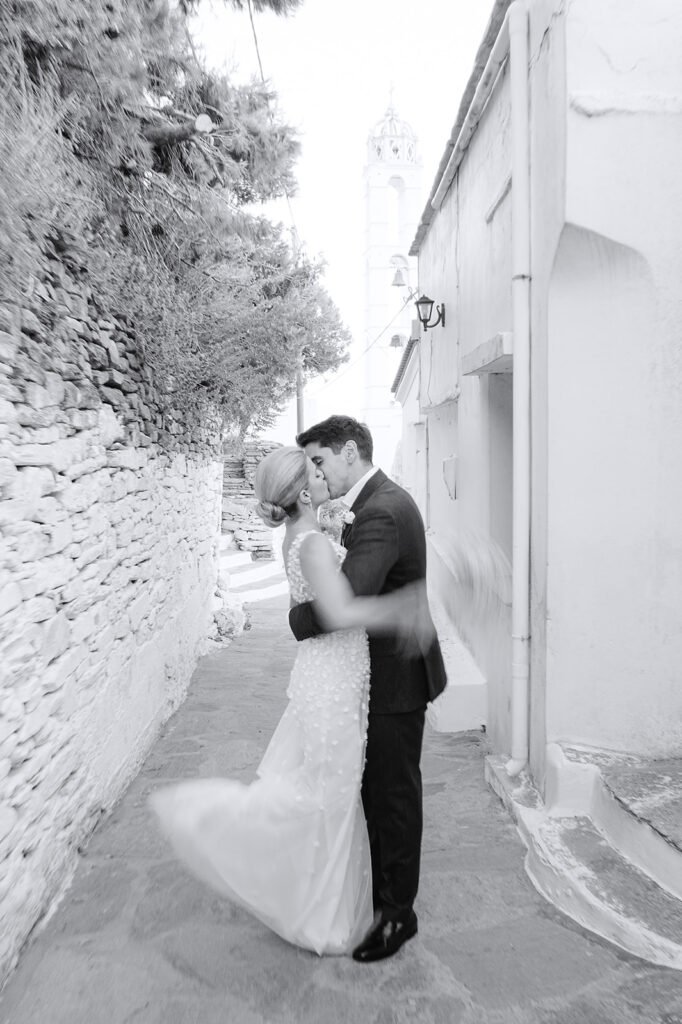 On the serene island of Tinos, in the heart of the Cyclades, Miltos and Fotini celebrated their union in a wedding that combined Greek tradition with a relaxed island-chic aesthetic. Their big day began in Tinos’ iconic whitewashed alleys, where a photo session forever captured their love and emotion against the island’s radiant light and architectural purity. At golden hour, the couple, hand in hand, walked along the rocky shoreline, the Aegean stretching endlessly behind them. The soft light, the movement of Fotini’s veil cascading in the air and the quiet intimacy of the moment created portraits that would be timeless.
