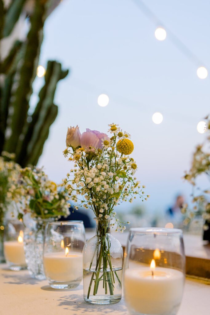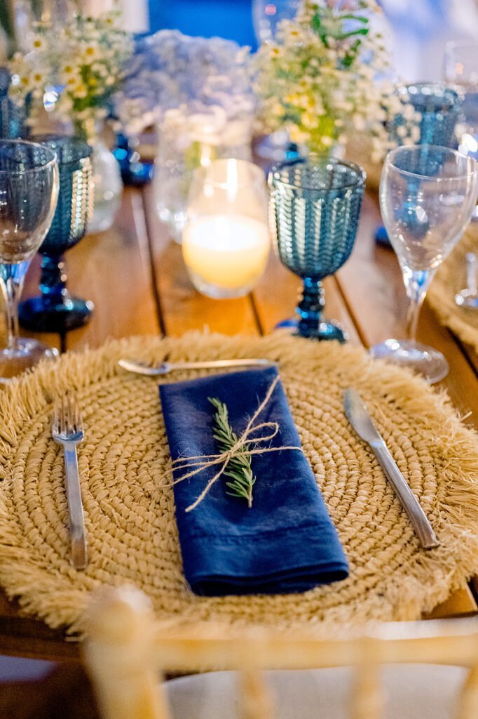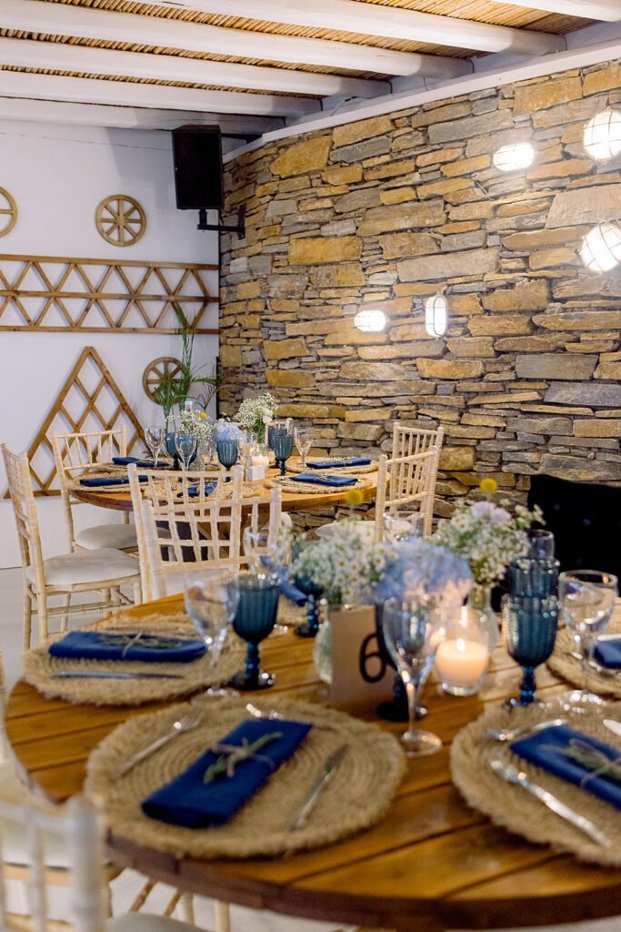 The reception at Omma embraced a rustic-chic mood, while the wedding menu, designed by Exo Catering, offered a traditional Greek culinary experience. Long wooden tables were set with woven chargers, deep-blue linen napkins tied with rosemary sprigs, soft candlelight, and delicate aromatic arrangements of chamomile and seasonal florals. The palette, which included ivory, natural straw textures, and Aegean blue, reflected the beauty of the surrounding landscape.